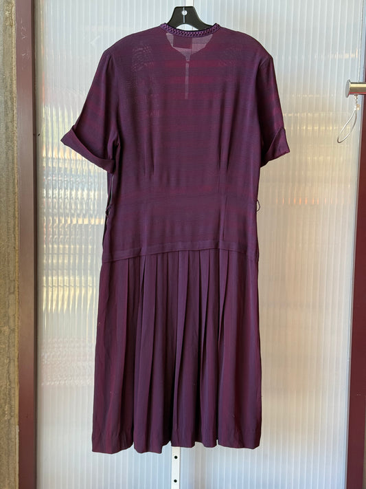 1940s Purple Striped Pleated Dress w/ Velvet Collar Trim