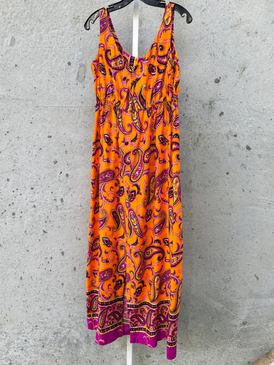 1970s Paisley Patterned Orange Drawstring Dress