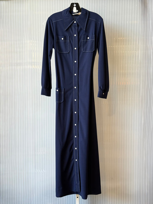 1970s Dark Blue Pearl Snap Full-Length Western Dress