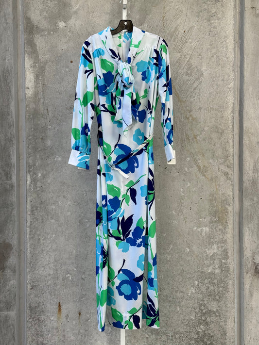 1970s White Dress with Blue & Green Floral Print