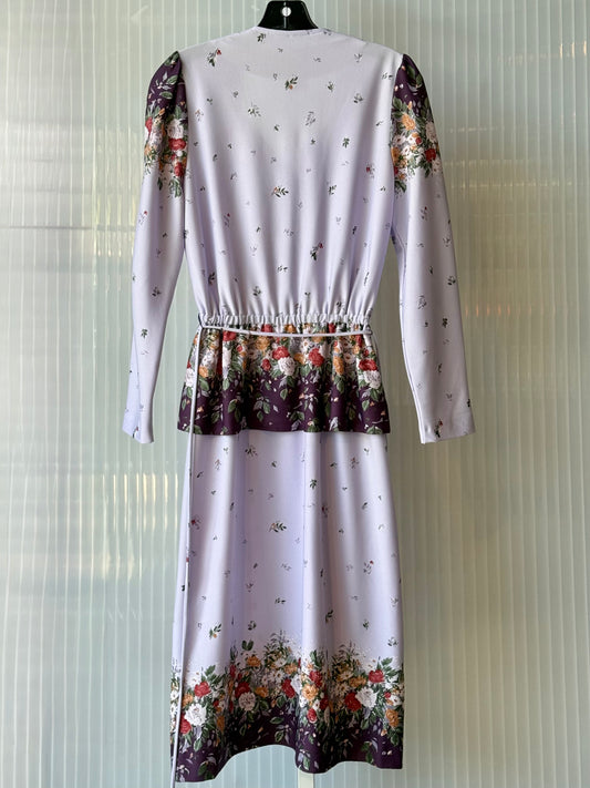 1970s Floral Print Lavender Peplum Dress