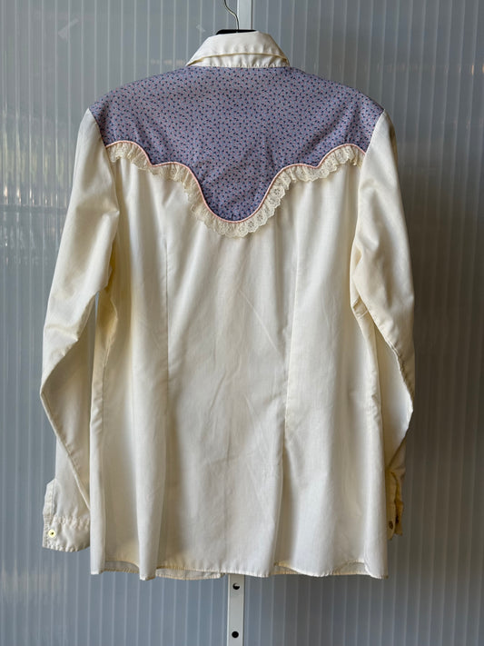 1970s Pearl Snap Western Blouse w/ Floral Yoke & Lace Trim