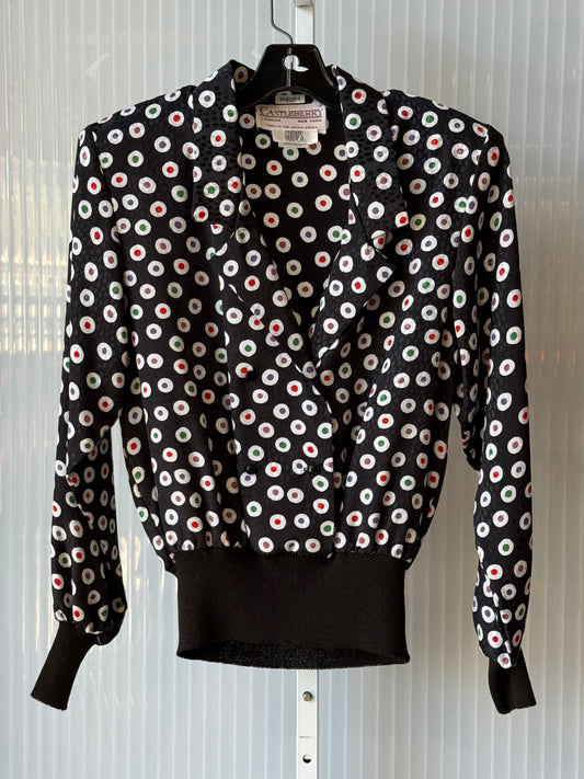 1980s Multicolor Dot Pattern Black Satin Top & Skirt Set