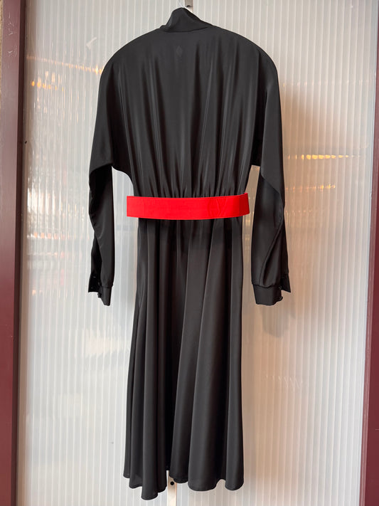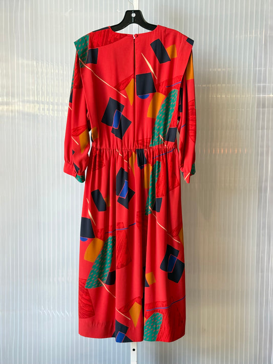 1980s Long-Sleeve Red Dress w/ Multicolor Geometric Pattern