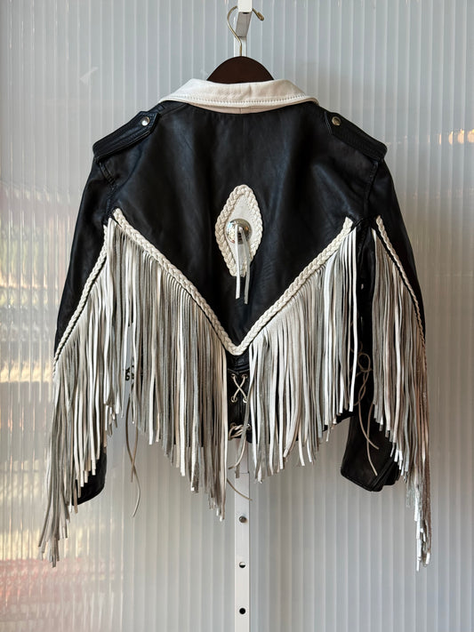 1980s Black & White Leather Biker Jacket w/ Fringe