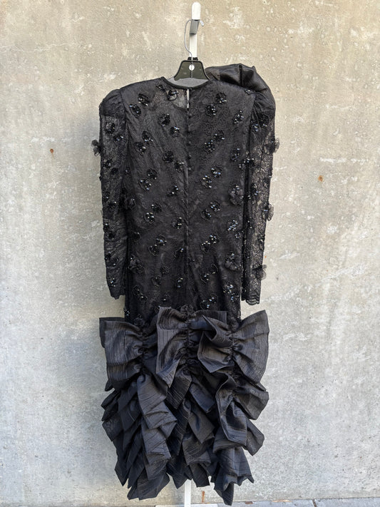 1980s Black Lacey Prom Dress w/ Flowers & Sequin Appliqué