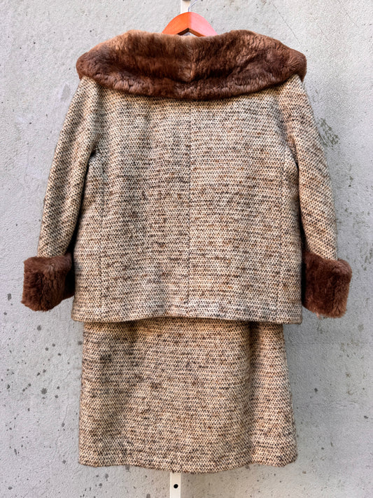 Wool Coat & Skirt Set with Fur Collar & Cuffs