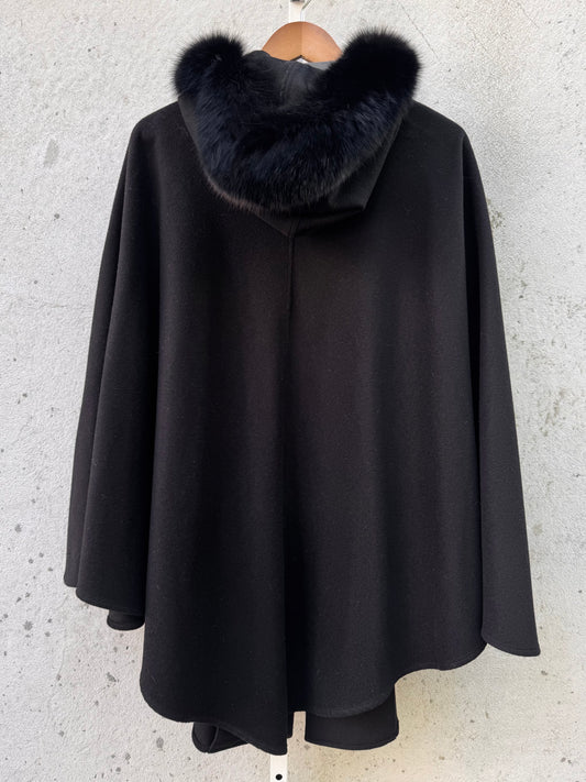 1980s Burberry Black Wool & Cashmere Cape with Fox Fur Collar