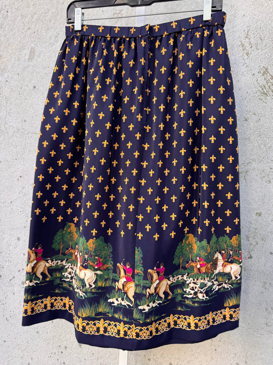 1980s Navy Blue Fox Hunting Print Midi Skirt