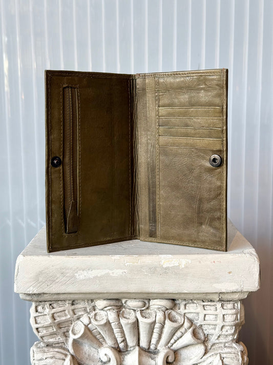 Olive Green Leather Floral Bi Fold Snap Wallet