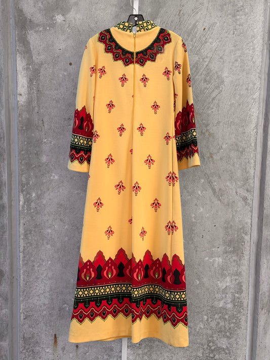 1970s Yellow Maxi Dress w/ Ornate Droplet Print