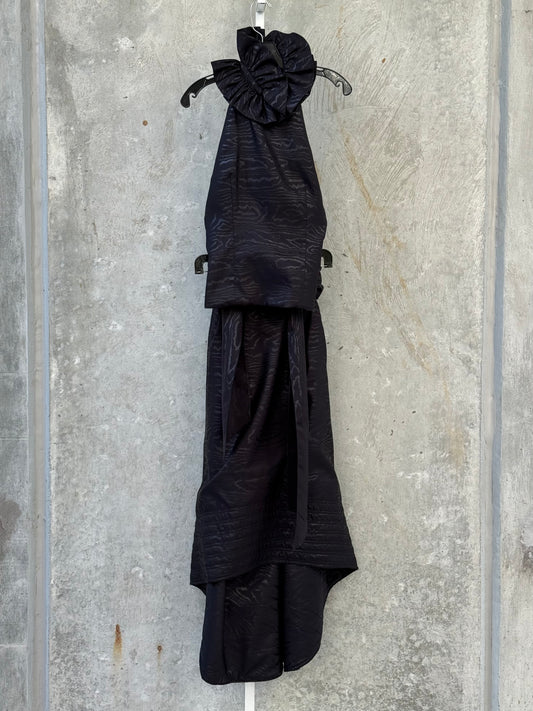 1990s Black Satin Ruffle Collar Top & Skirt Set