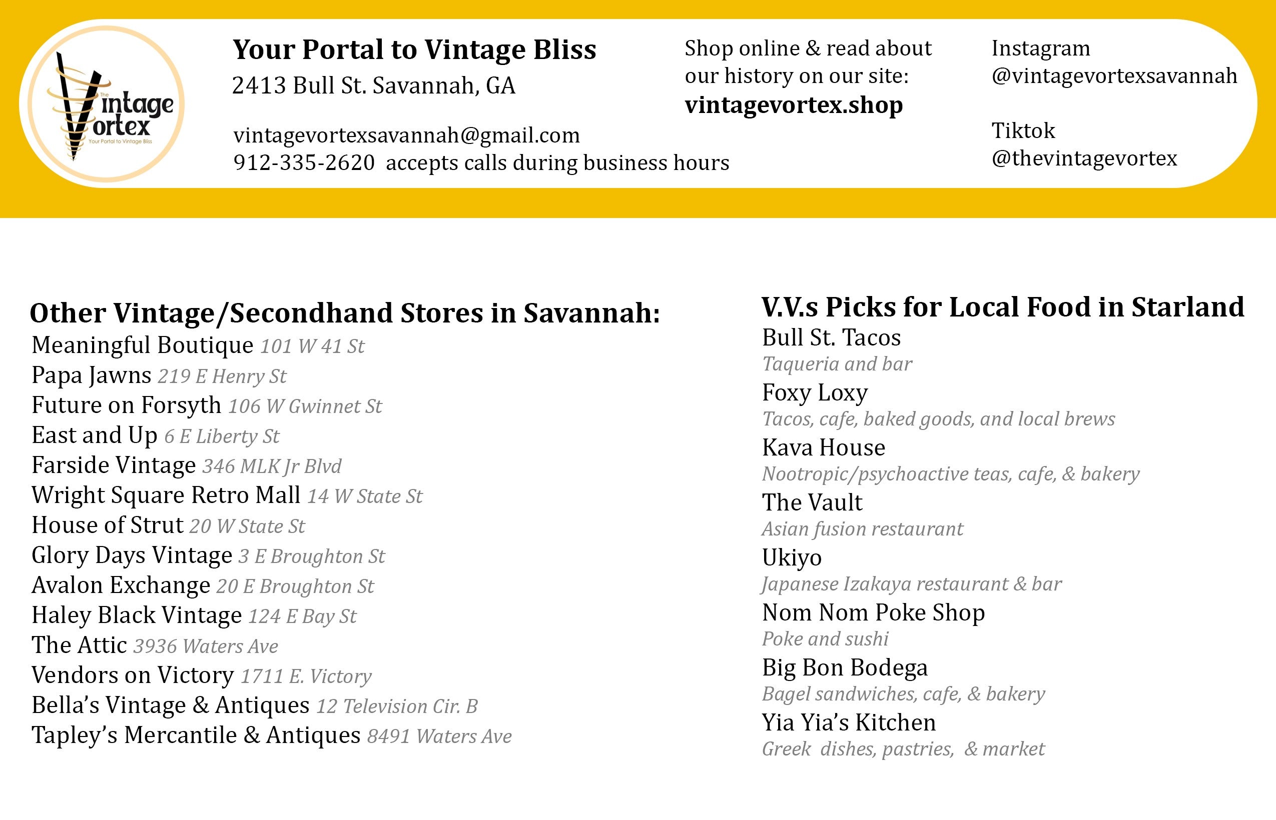 Below the legend, you'll find a list of all brick-and-mortar vintage stores in Savannah as well as their addresses. All ordered by distance, closest to farthest, from the Vintage Vortex.