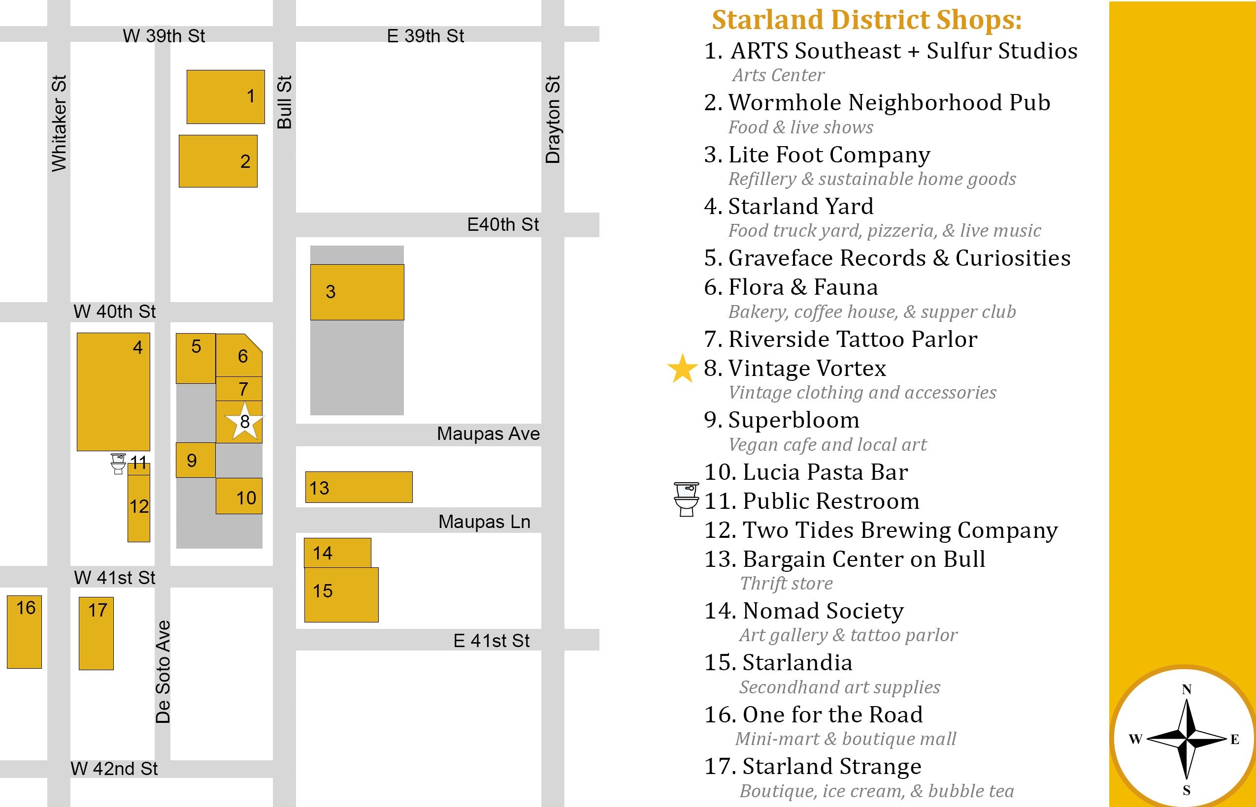 Attached below is a map showcasing a portion of Savannah, GA's Starland district. In the legend, you'll find the names of local businesses as well as a short blurb of what they have to offer.