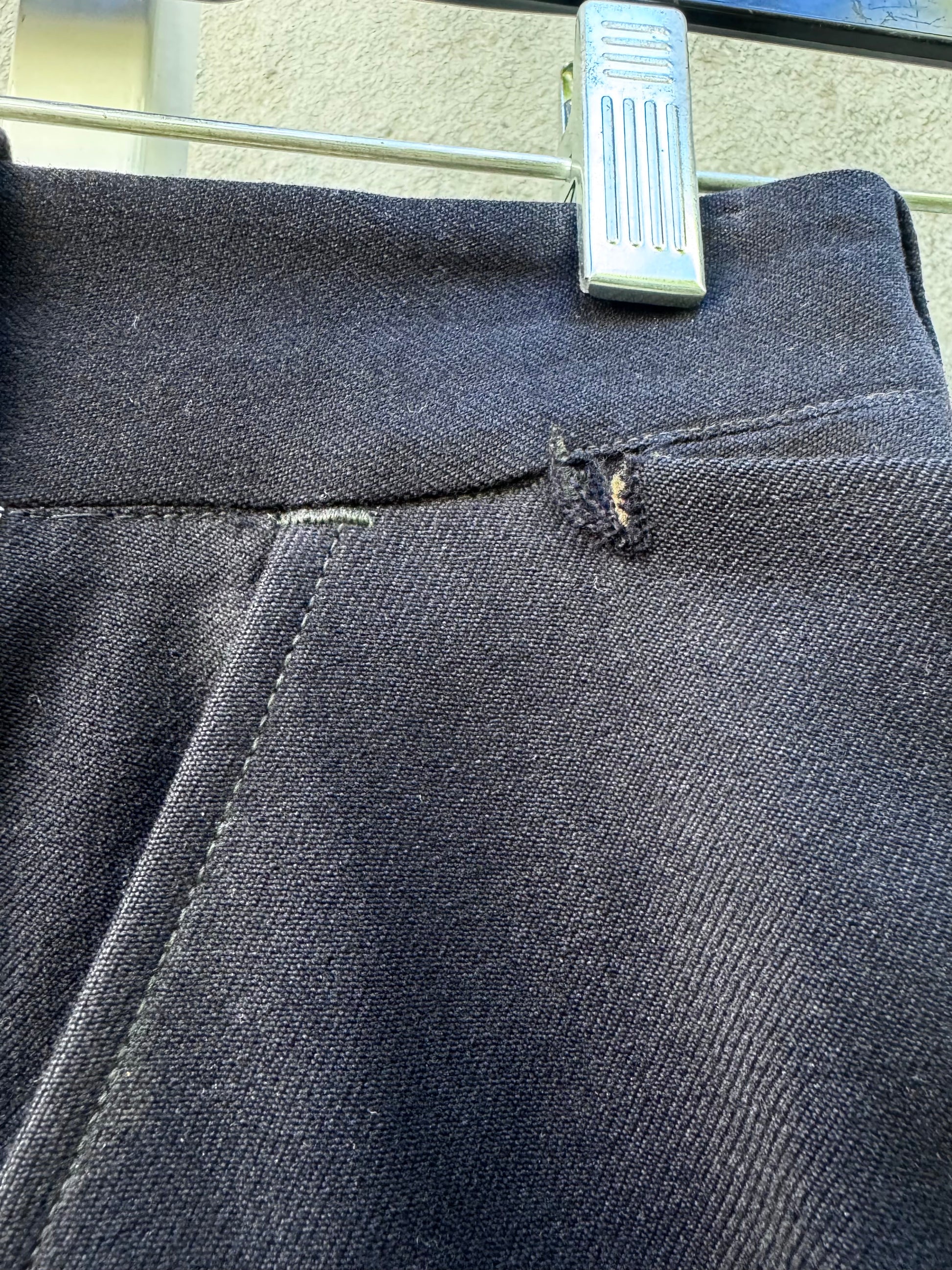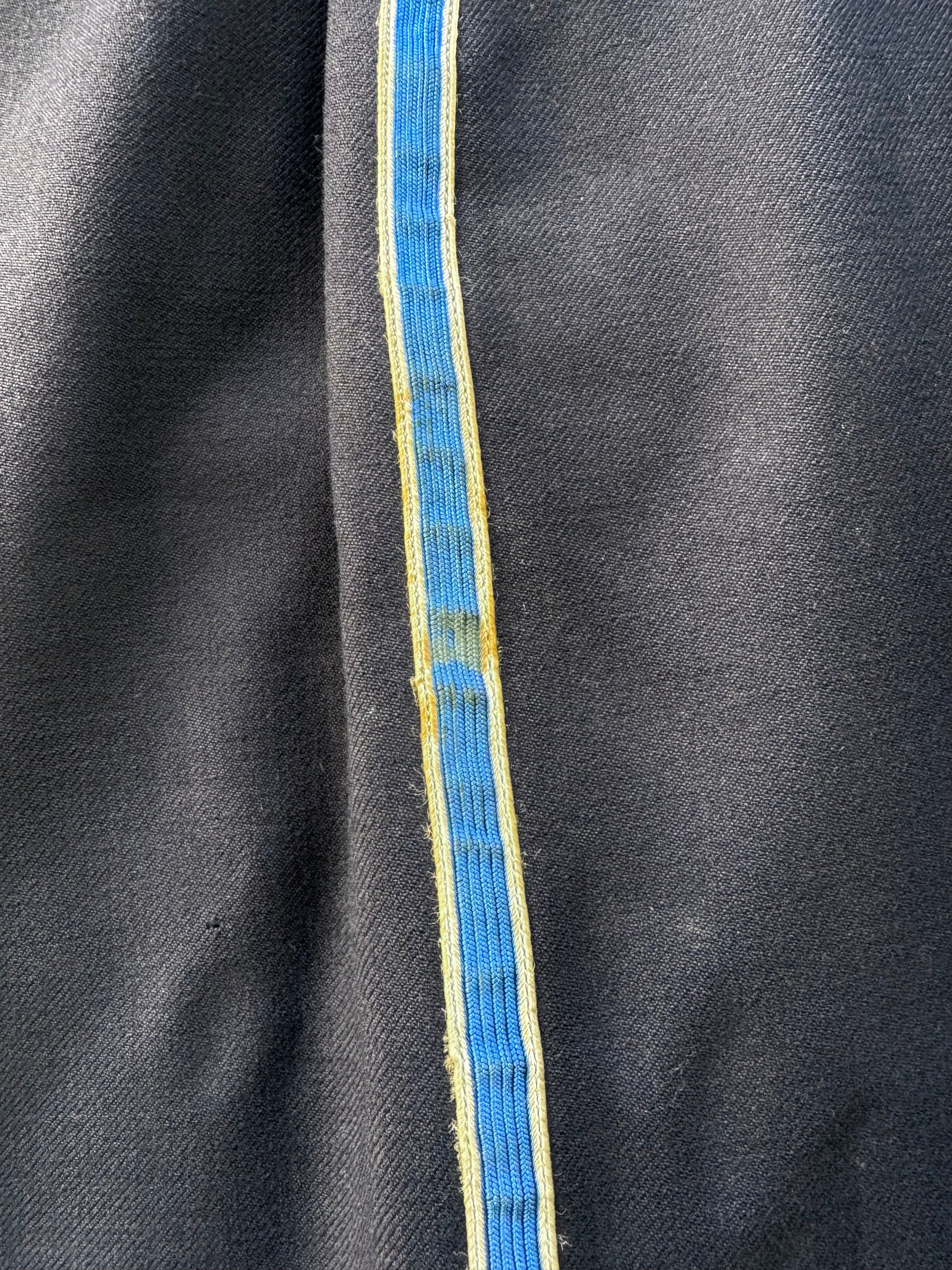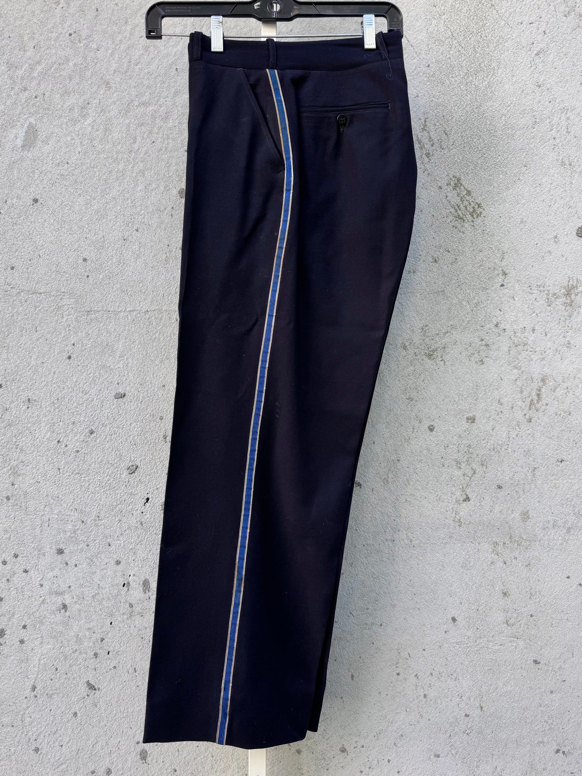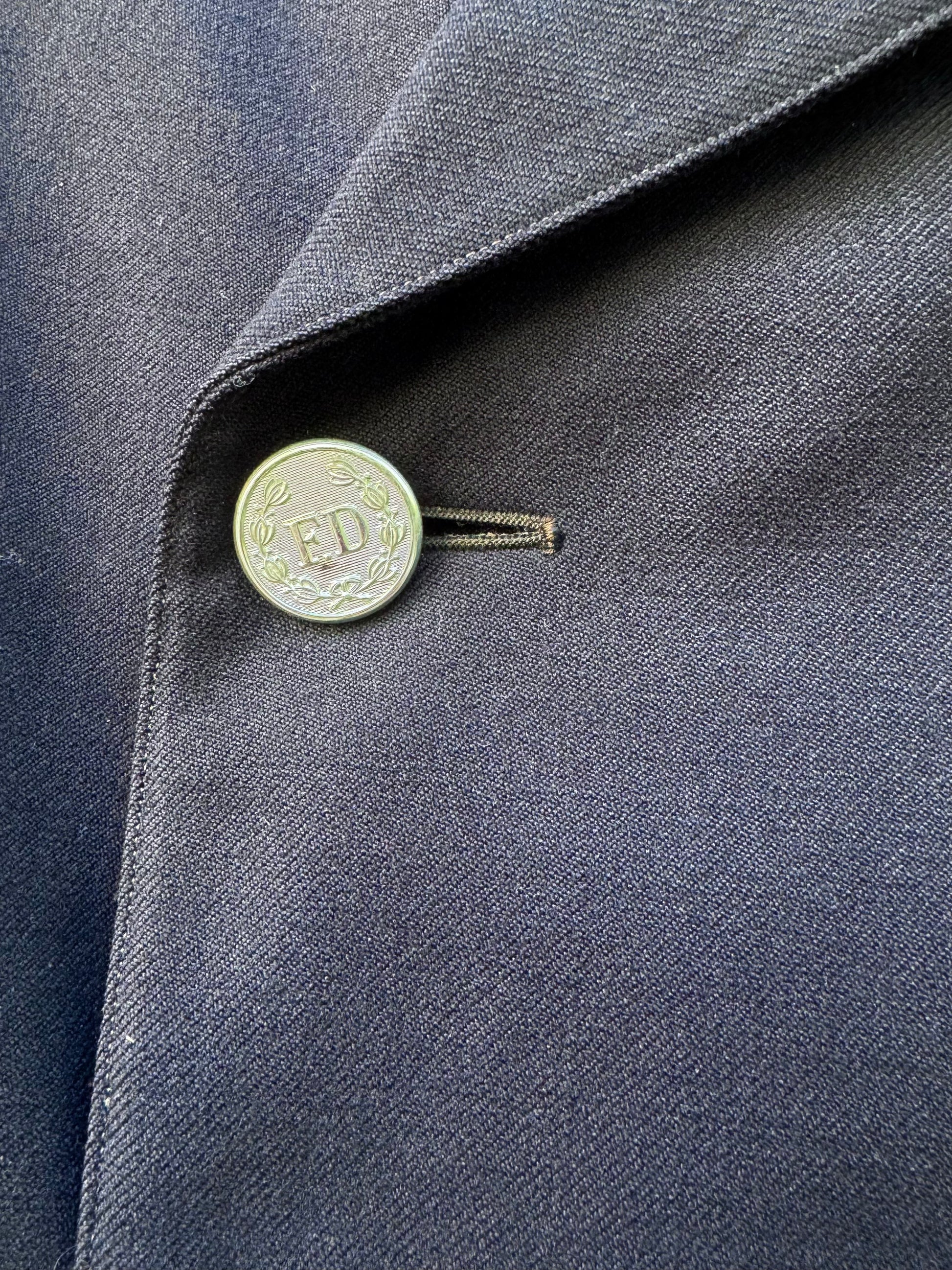 Savannah GA's Fire Department navy blue double breasted notched lapel uniform dress jacket with silver buttons and pants with blue tuxedo stripe from the 1950s (based on styling and garment construction as well as images of other 50s fire dept. uniforms in Savannah)