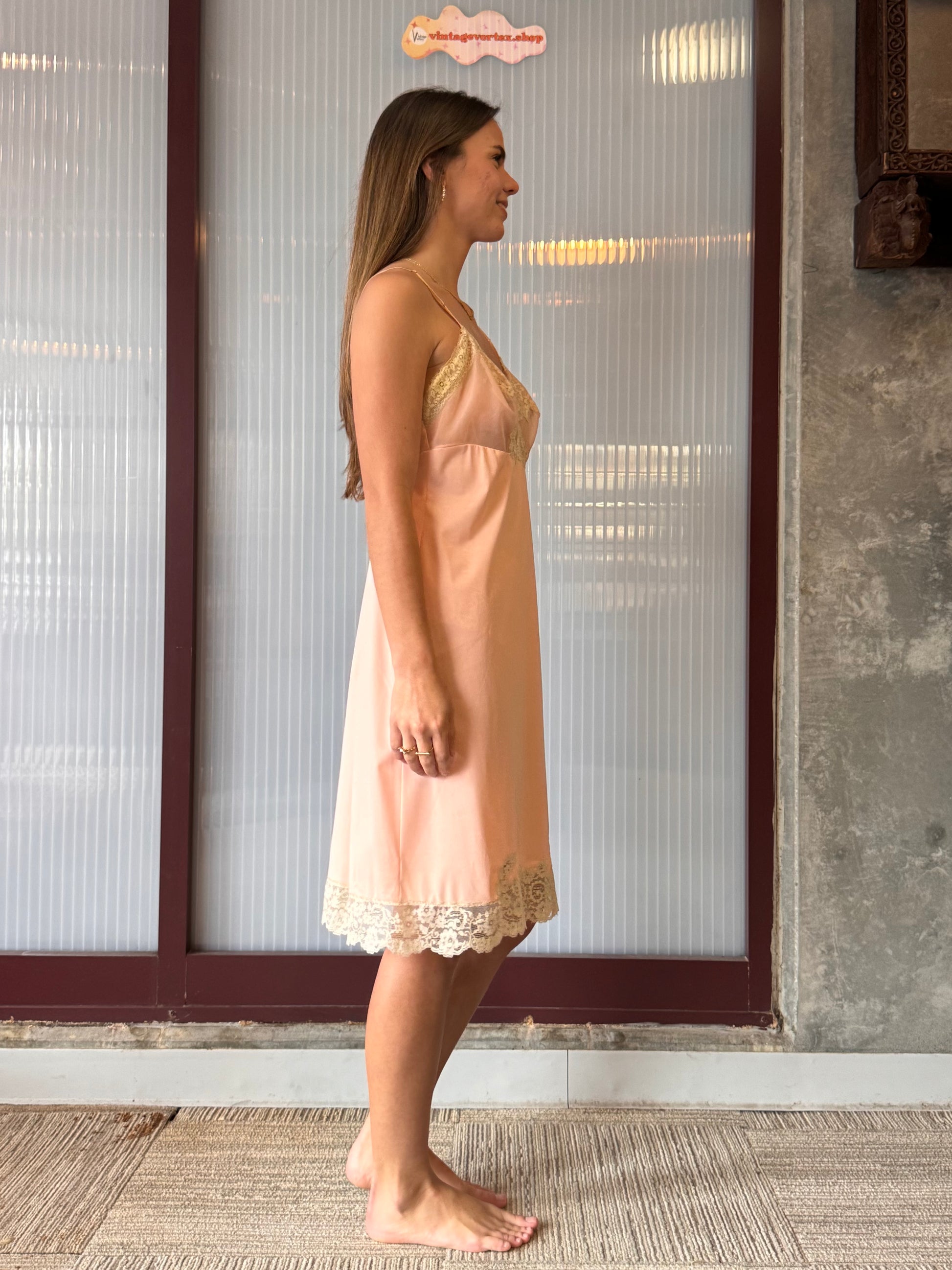 1950s Van Raalte peach-pink slip dress with cream lace neckline and hem