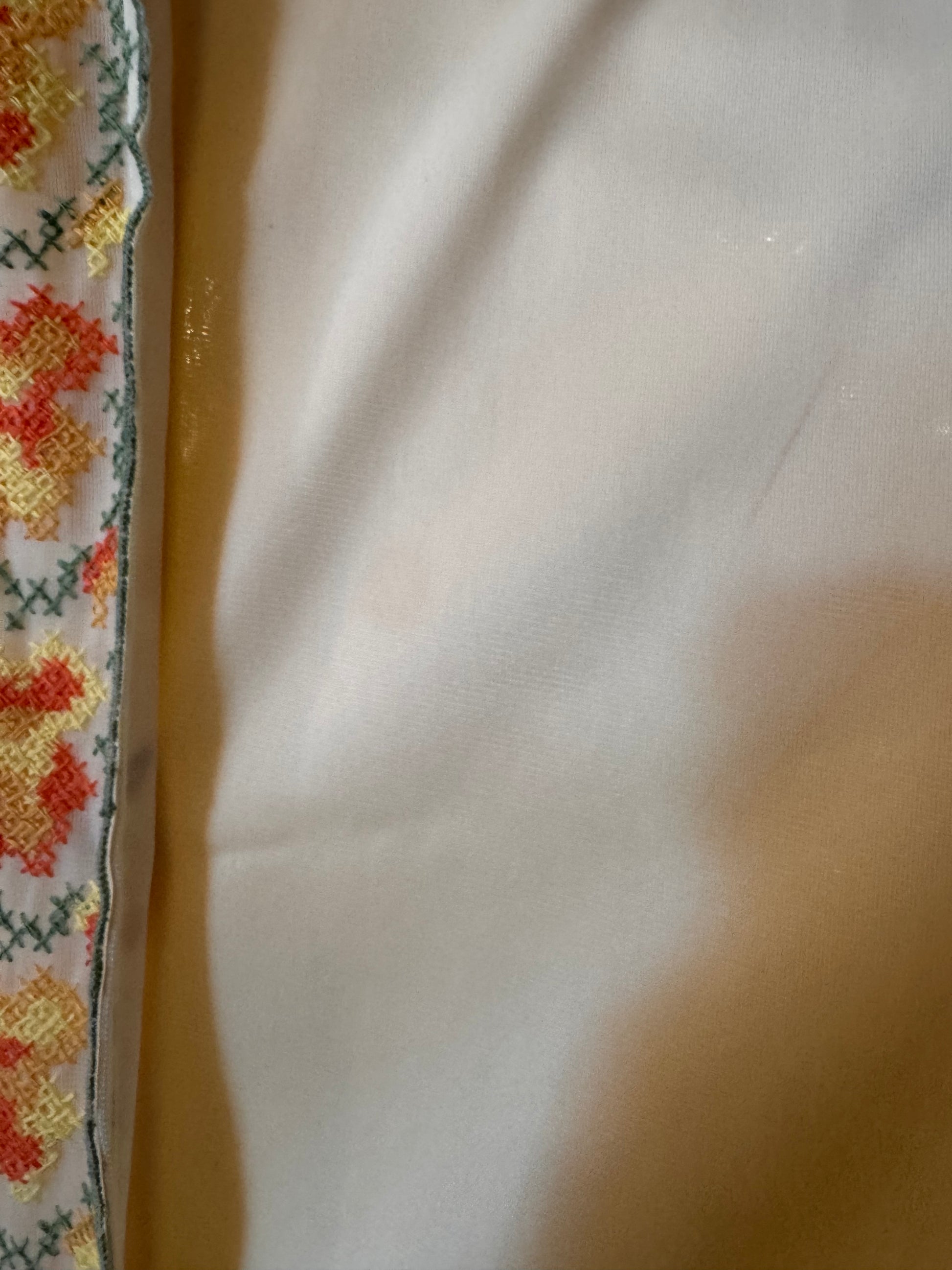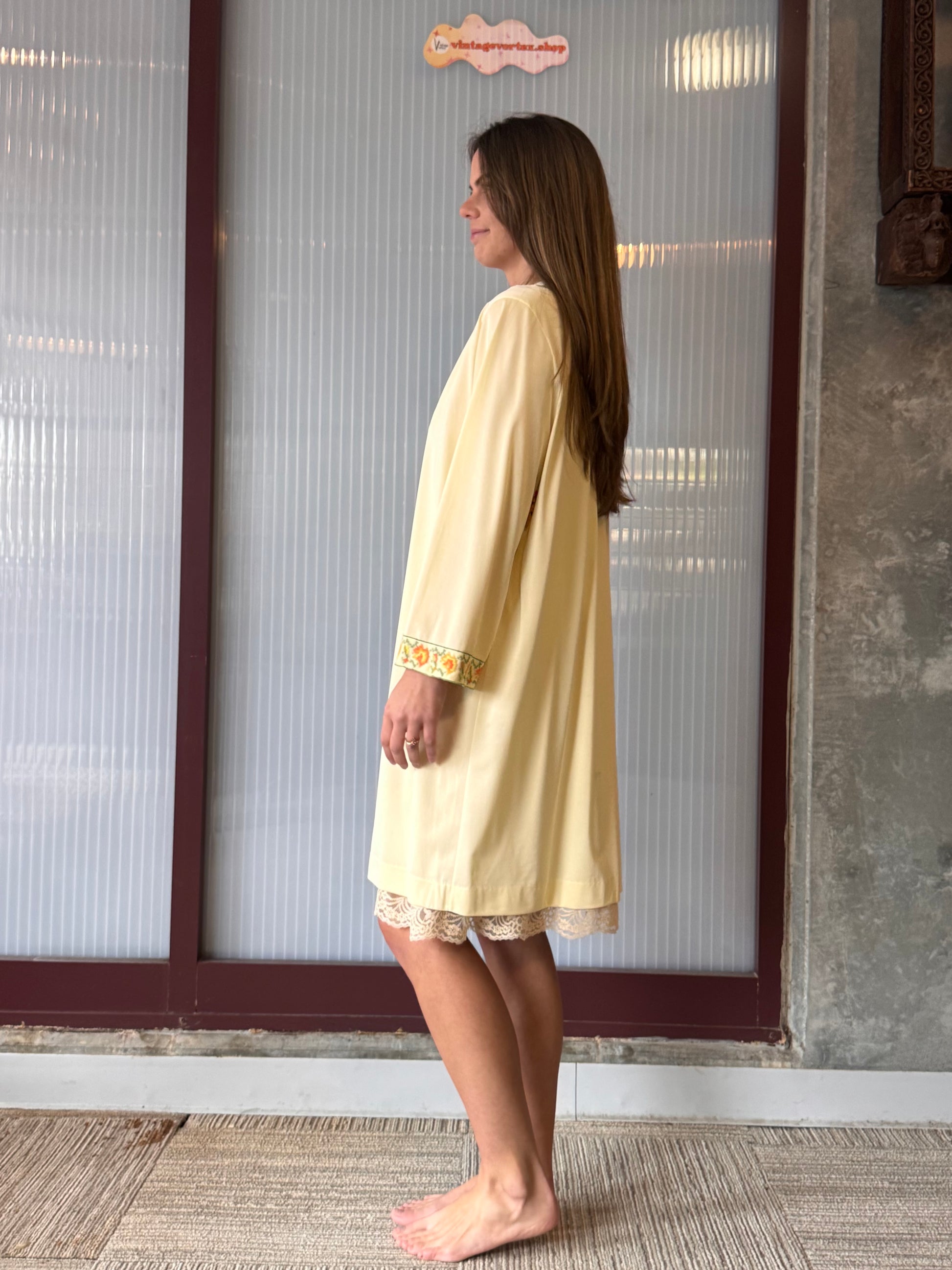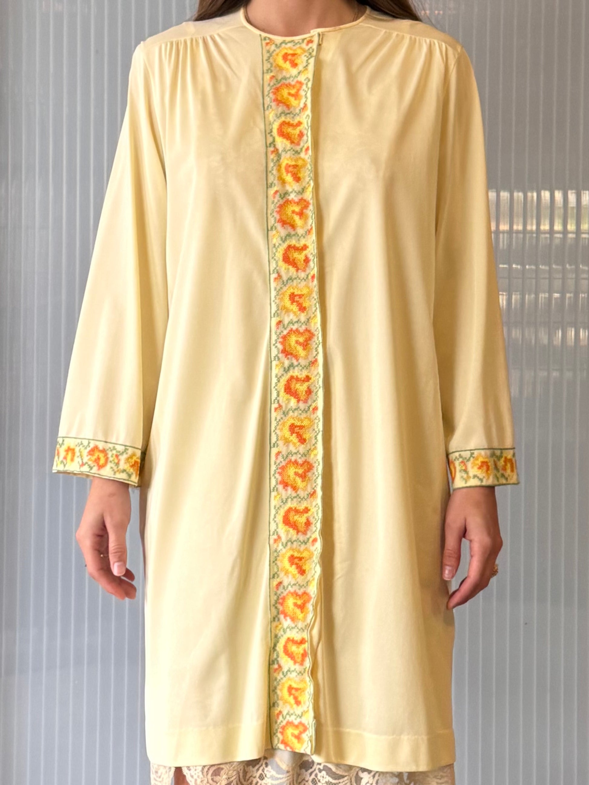 1960s Gossard Artemis pastel / light yellow long-sleeve nightgown with orange and green cross-stitch details. Has pockets!