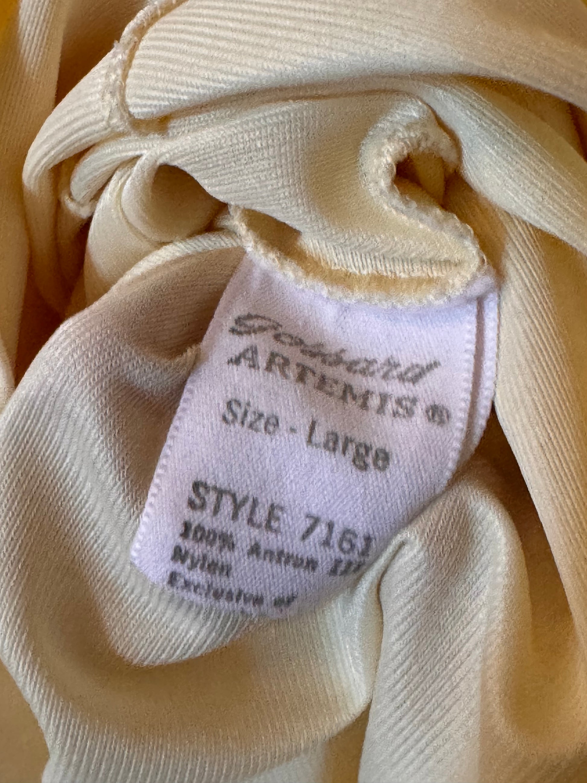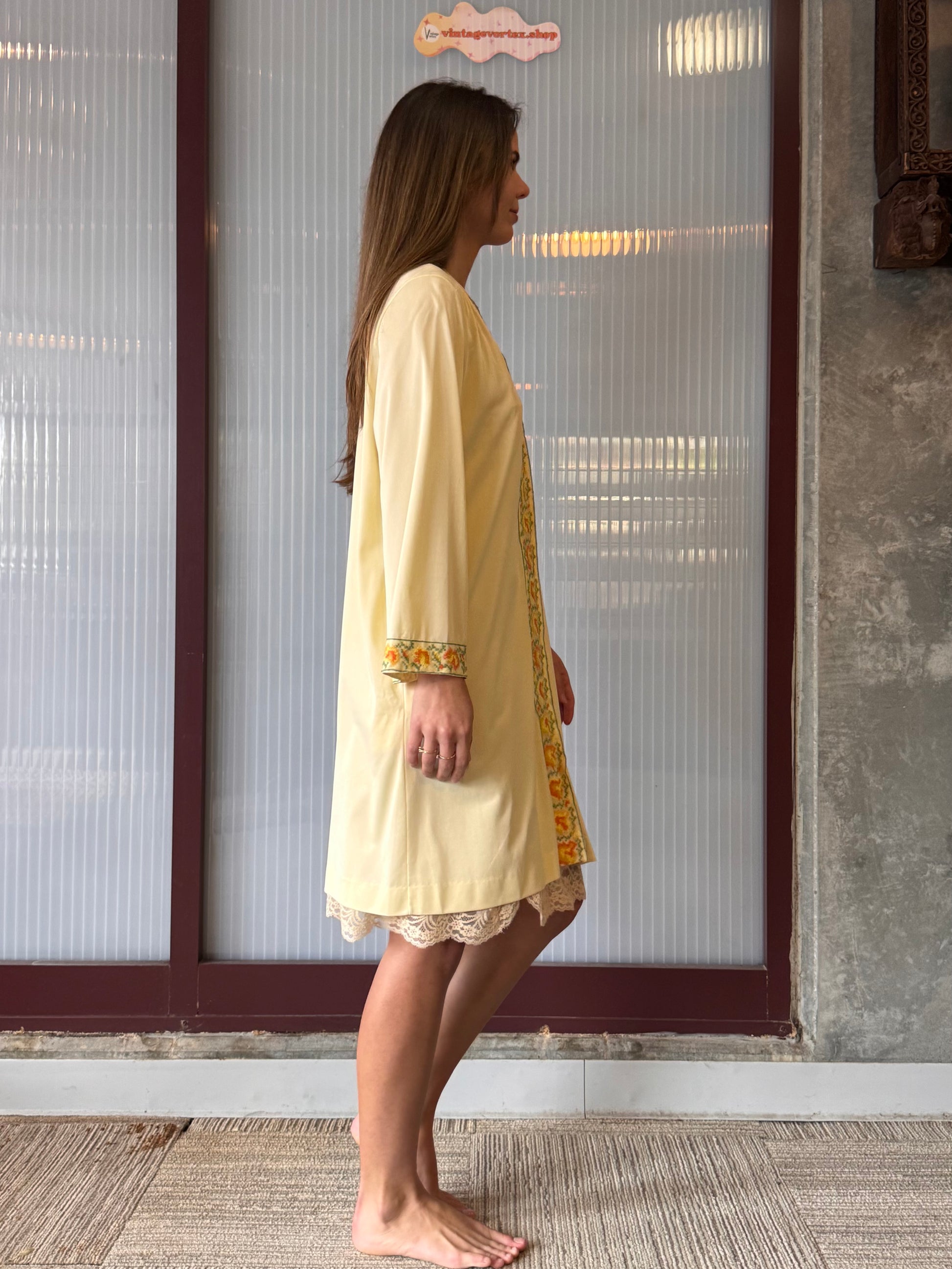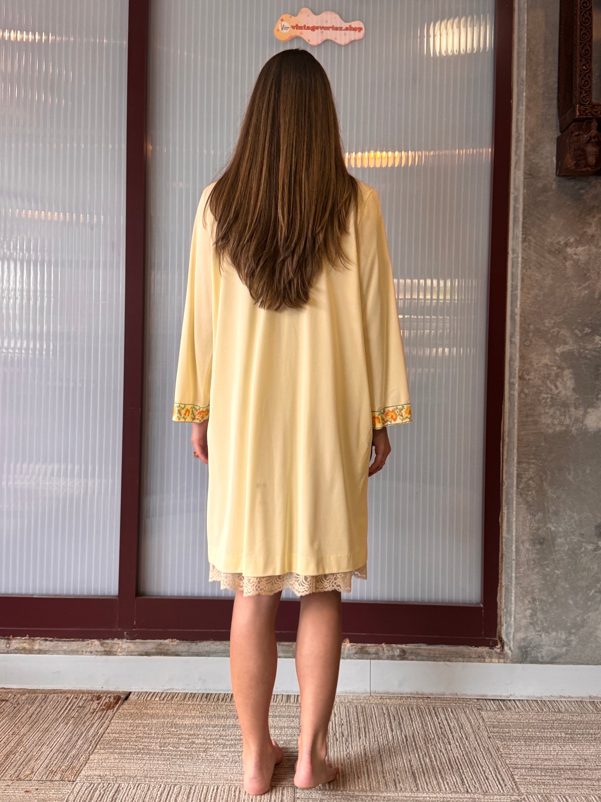 1960s Gossard Artemis pastel / light yellow long-sleeve nightgown with orange and green cross-stitch details. Has pockets!