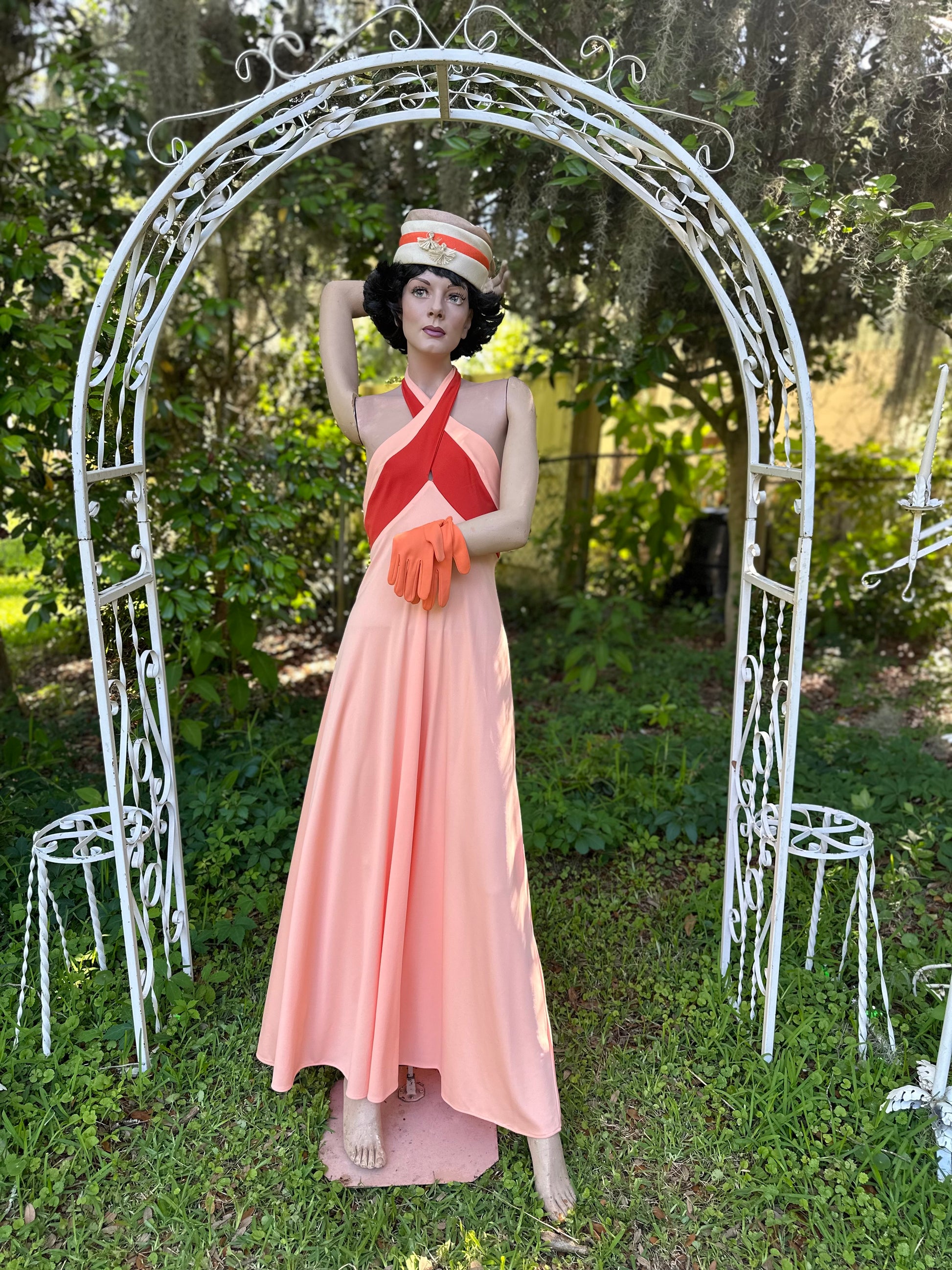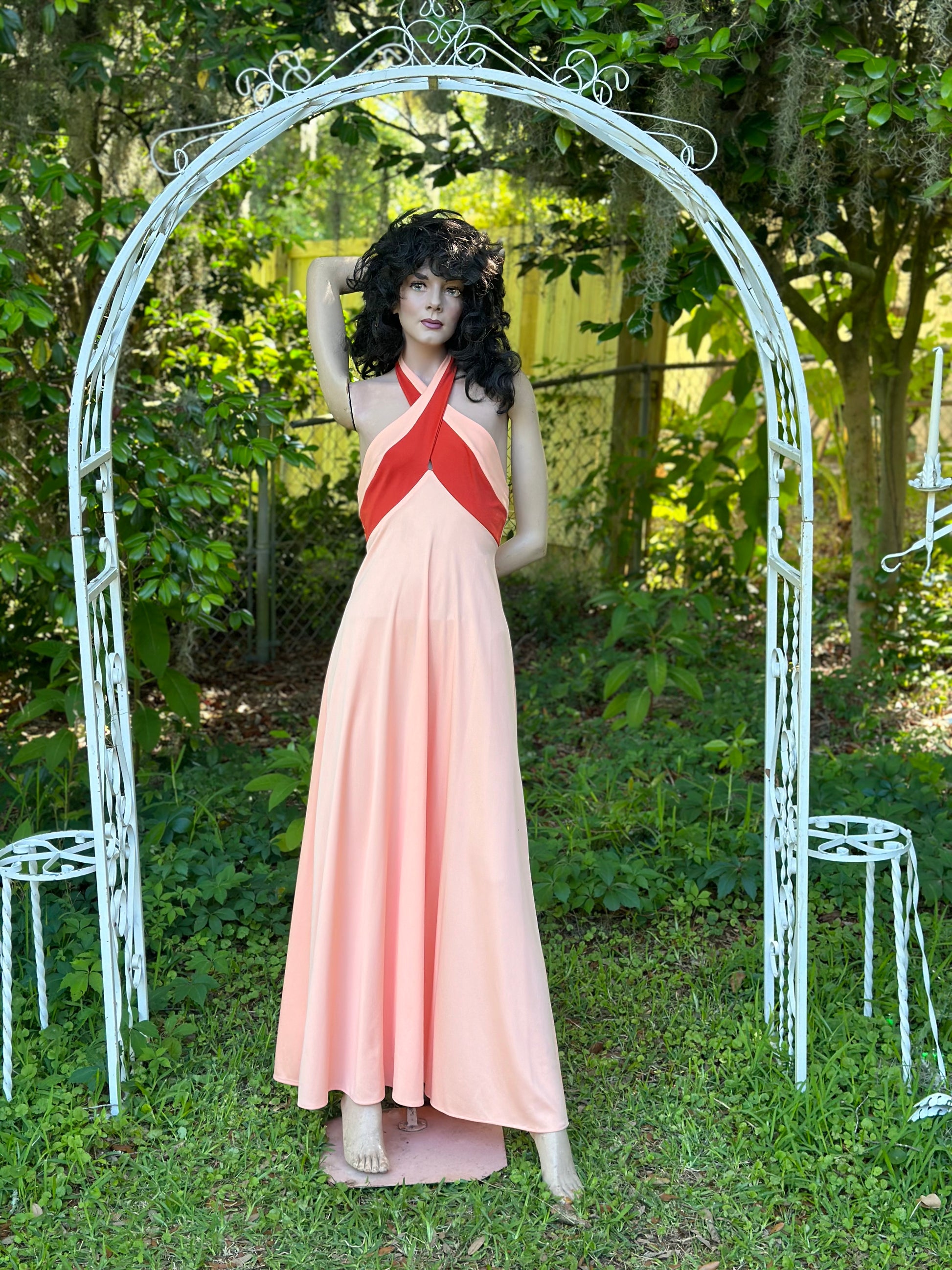 Turn heads in this gorgeous dual-toned 70’s peach maxi dress🕺