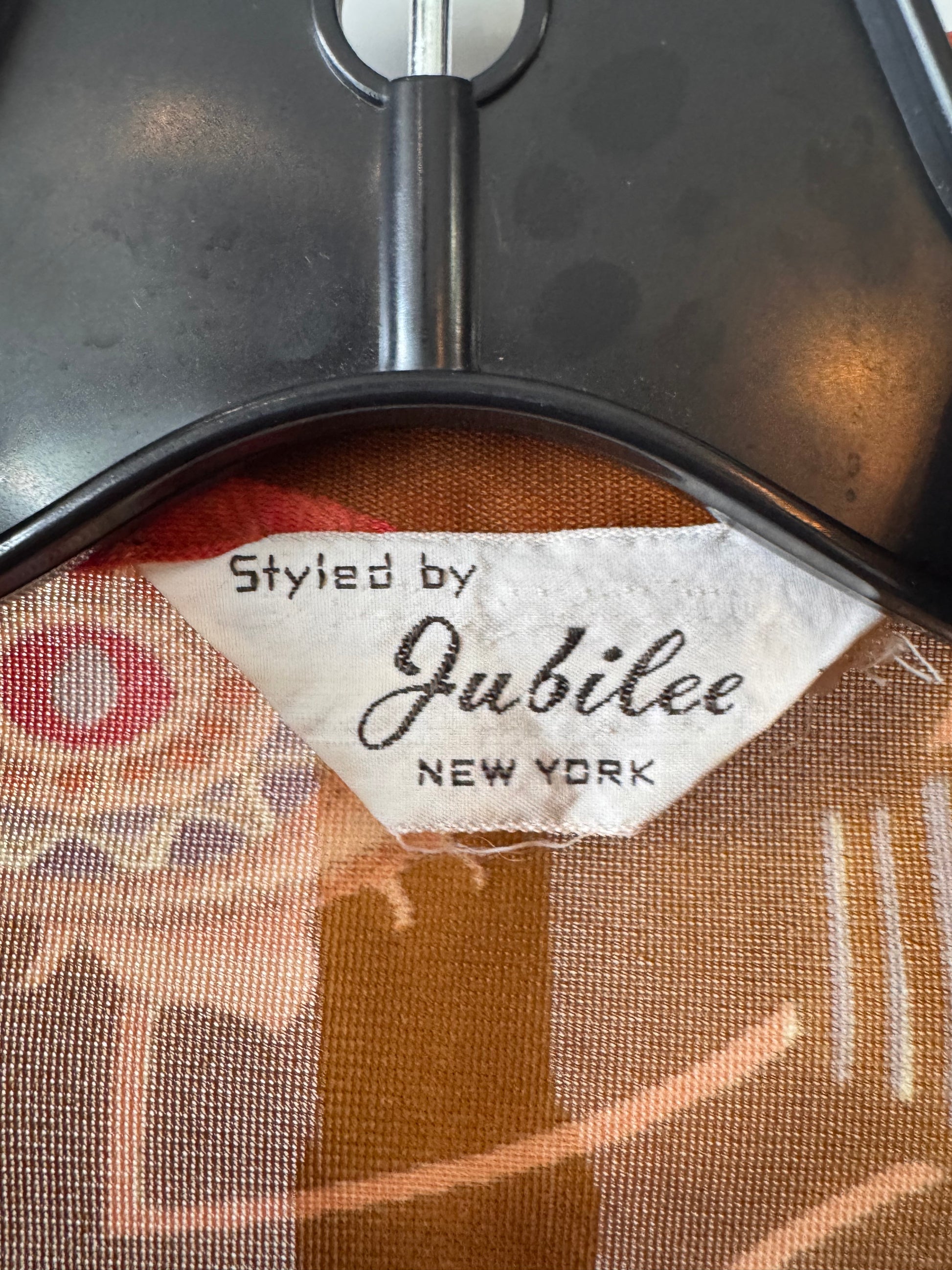 1970s brown, red, and orange long-sleeve button up shirt with owl pattern