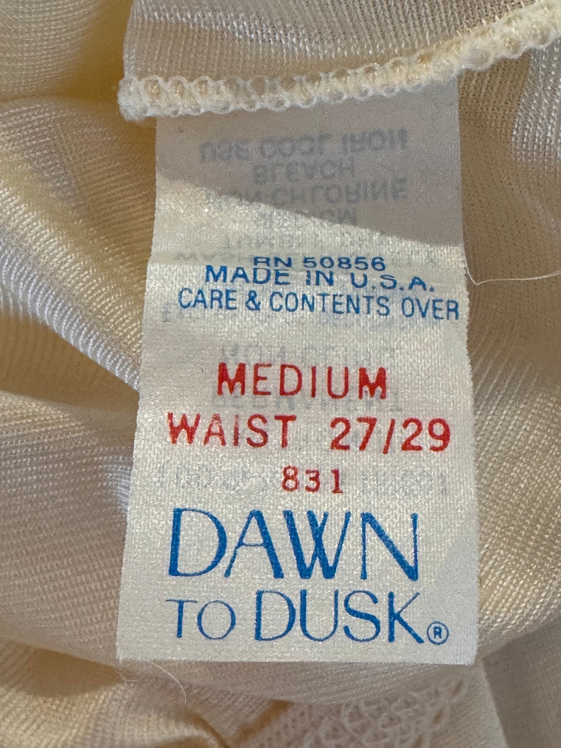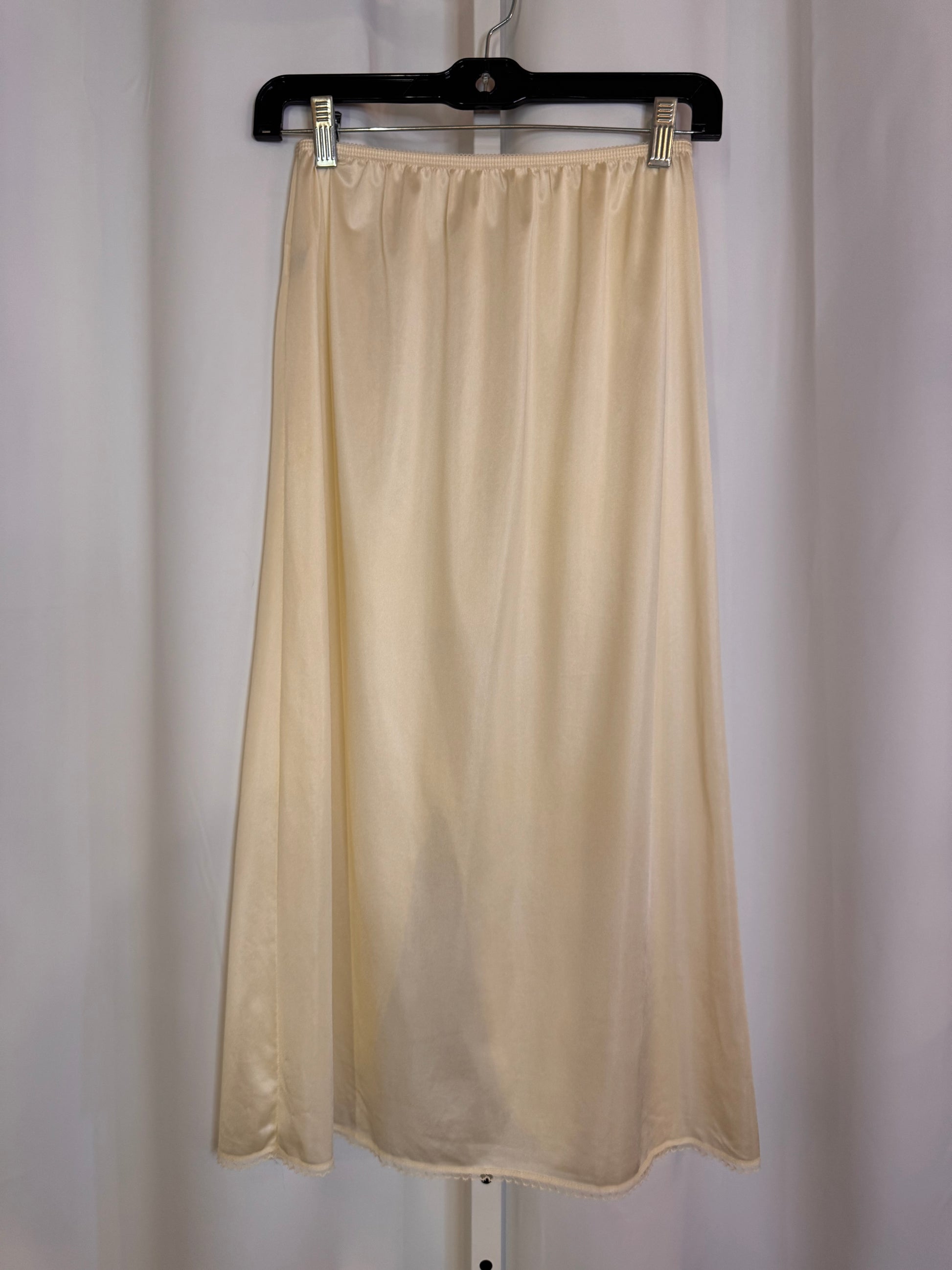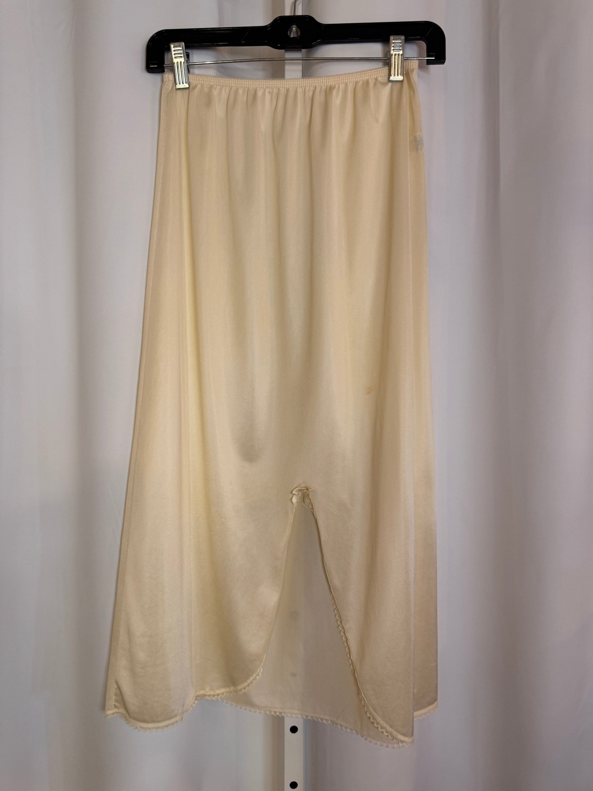 1970s ivory skirt slip with dainty lace hem and bow with leg slit