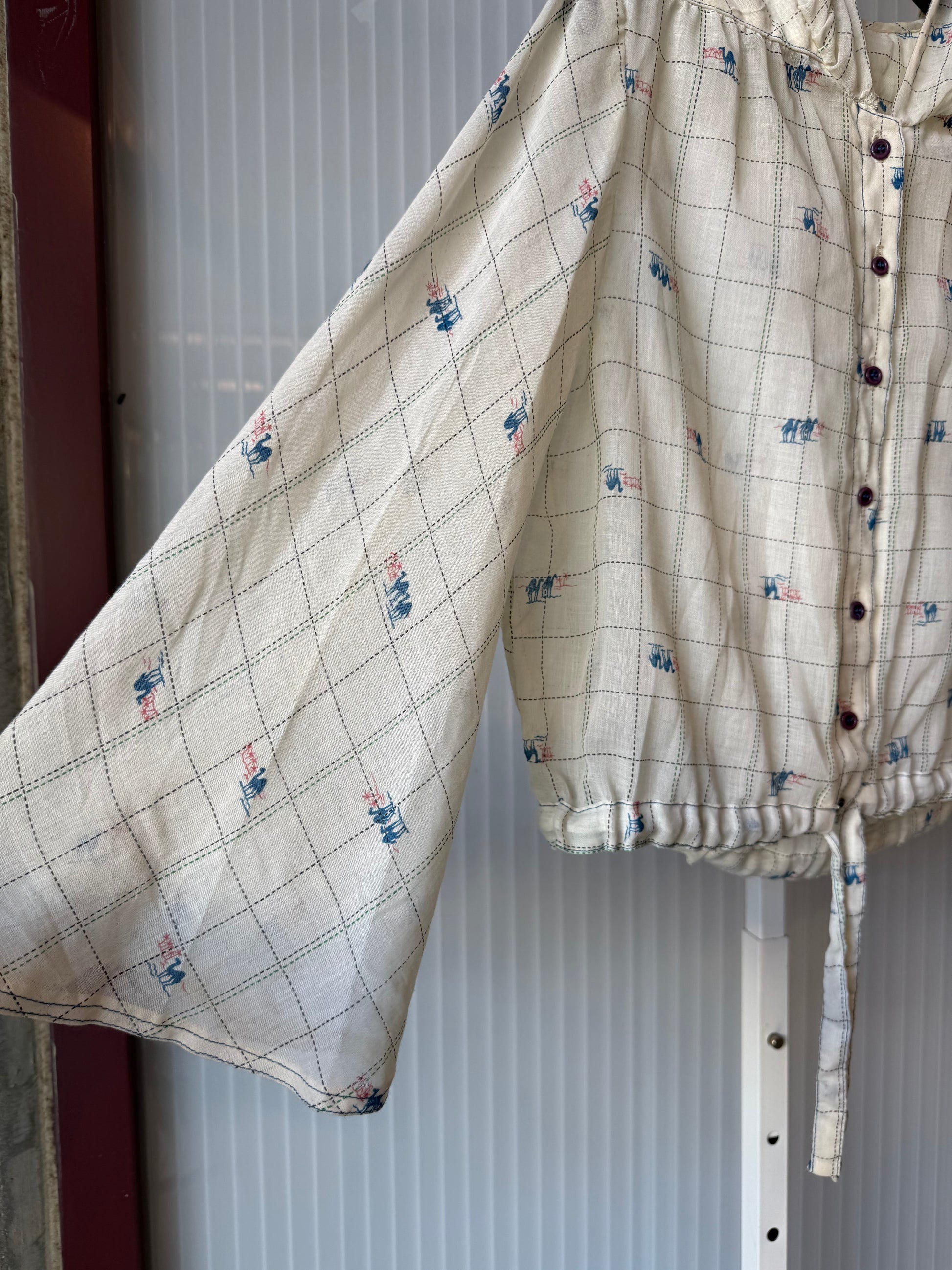 1970s Cream Sheer Cinch Waist Hooded Blouse w/ Camel Print