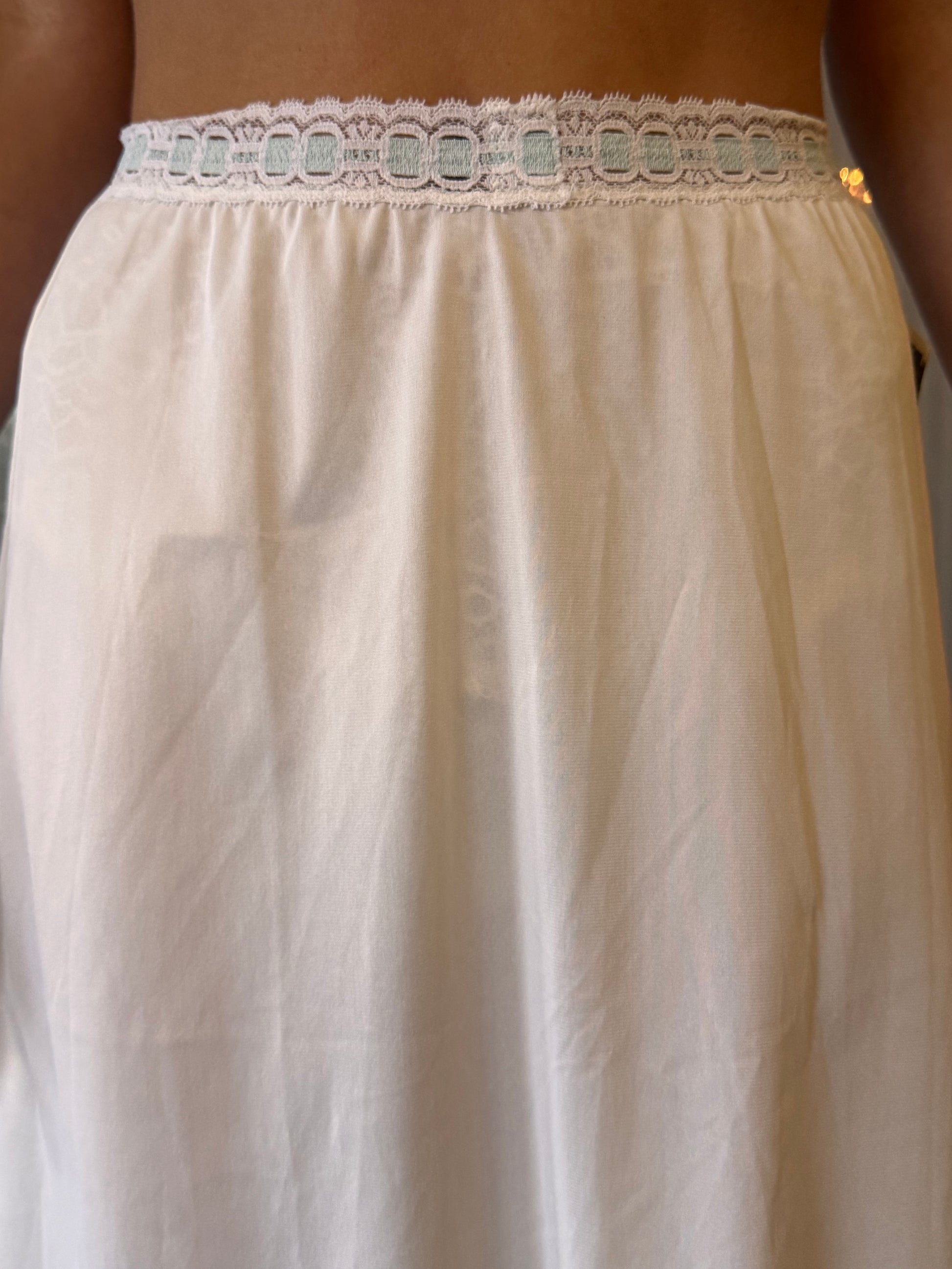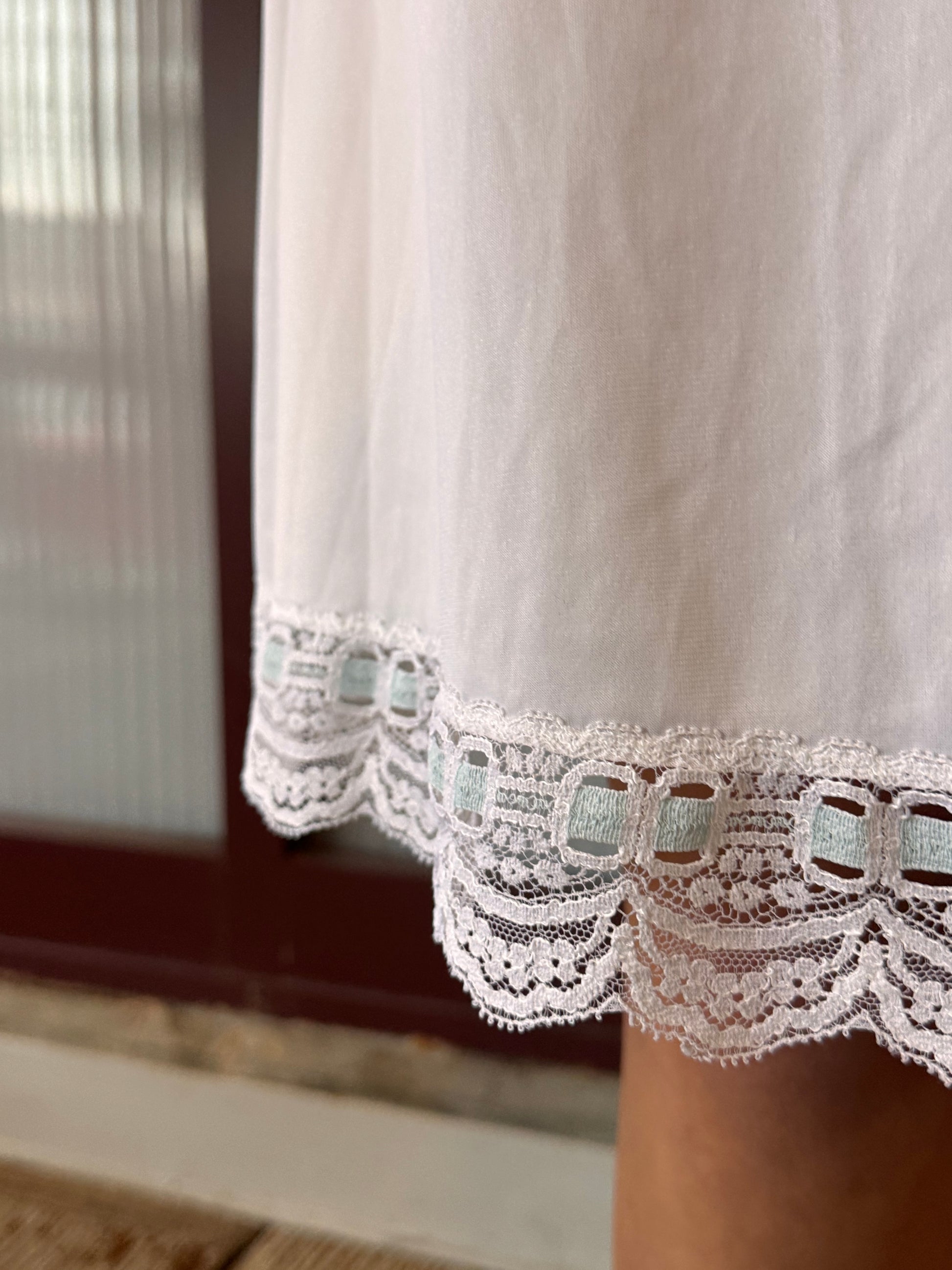 1970s Olga white skirt slip with light blue faux-ribbon in waist and hem lace