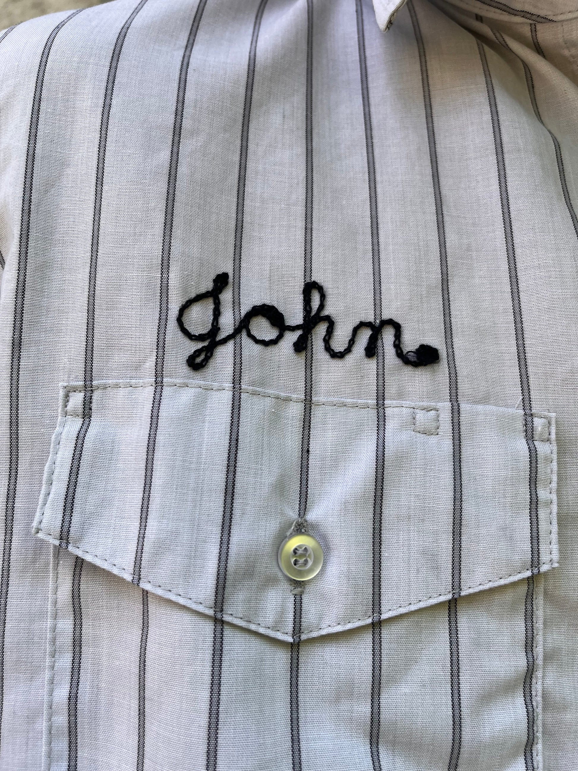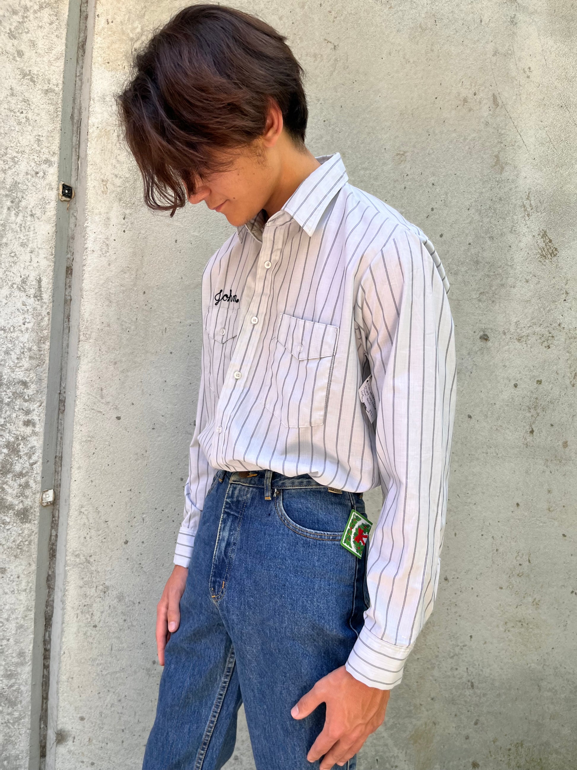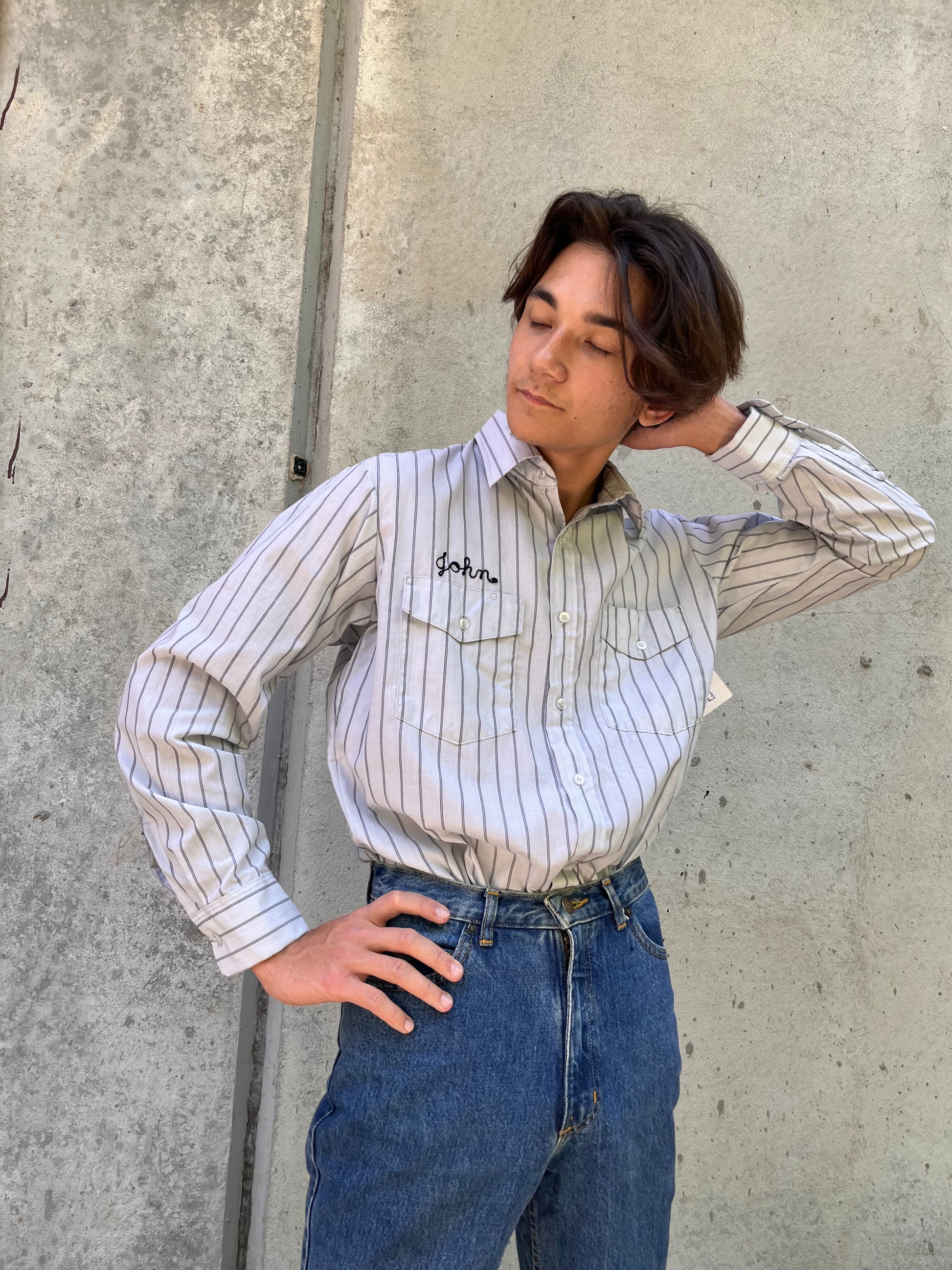 1970s Unitog White & Grey Striped "John" Embroidered Button-Up