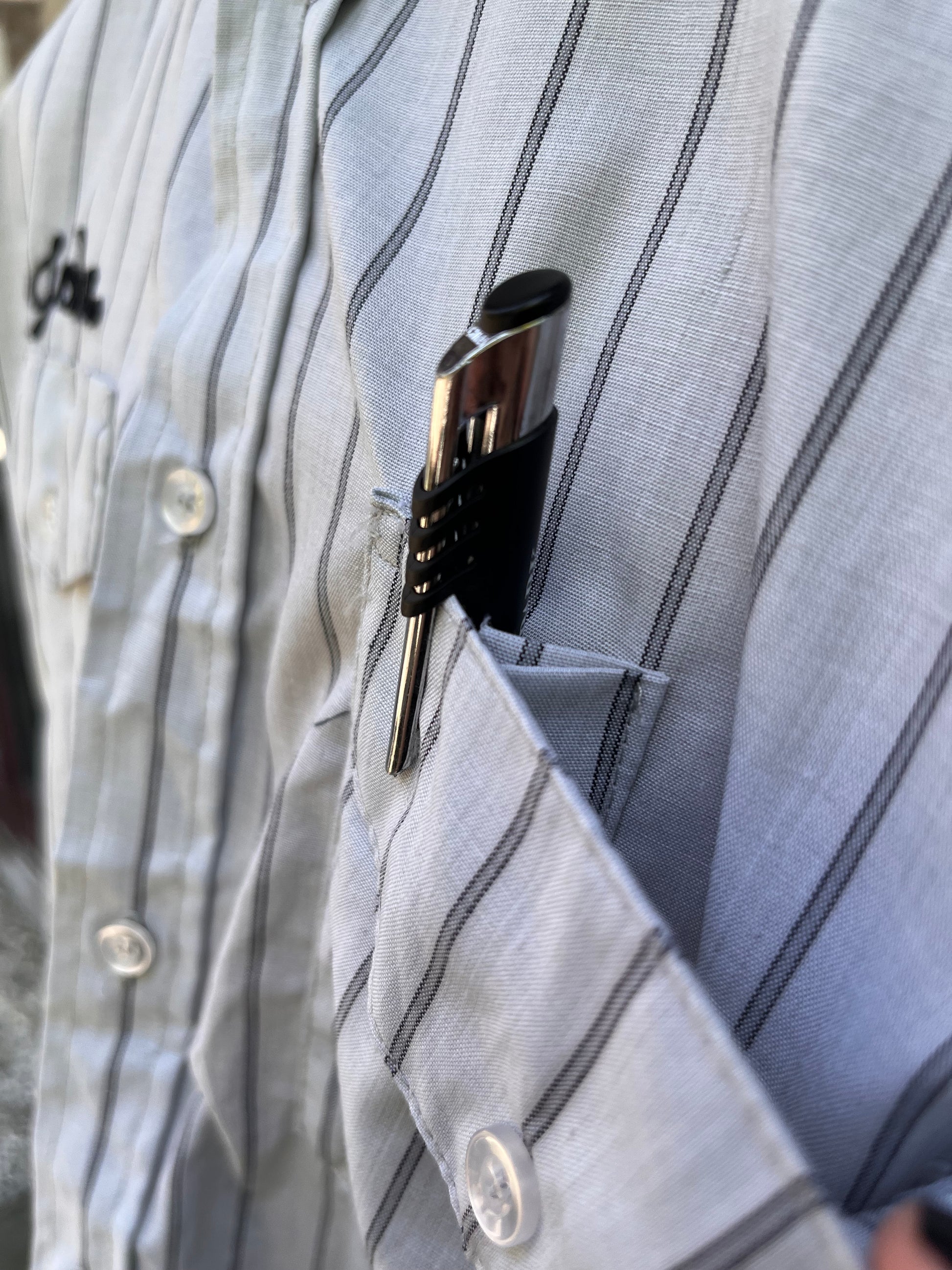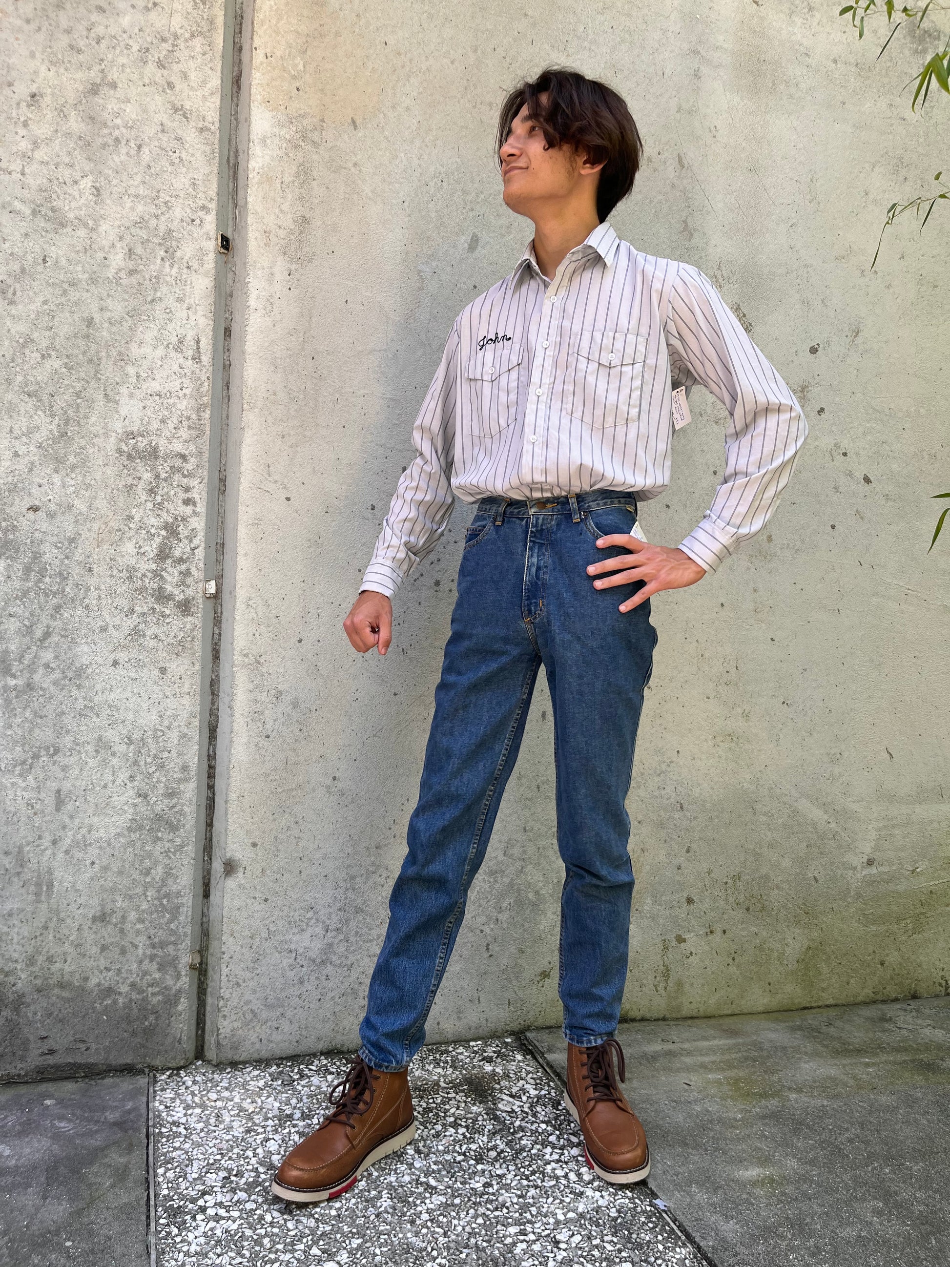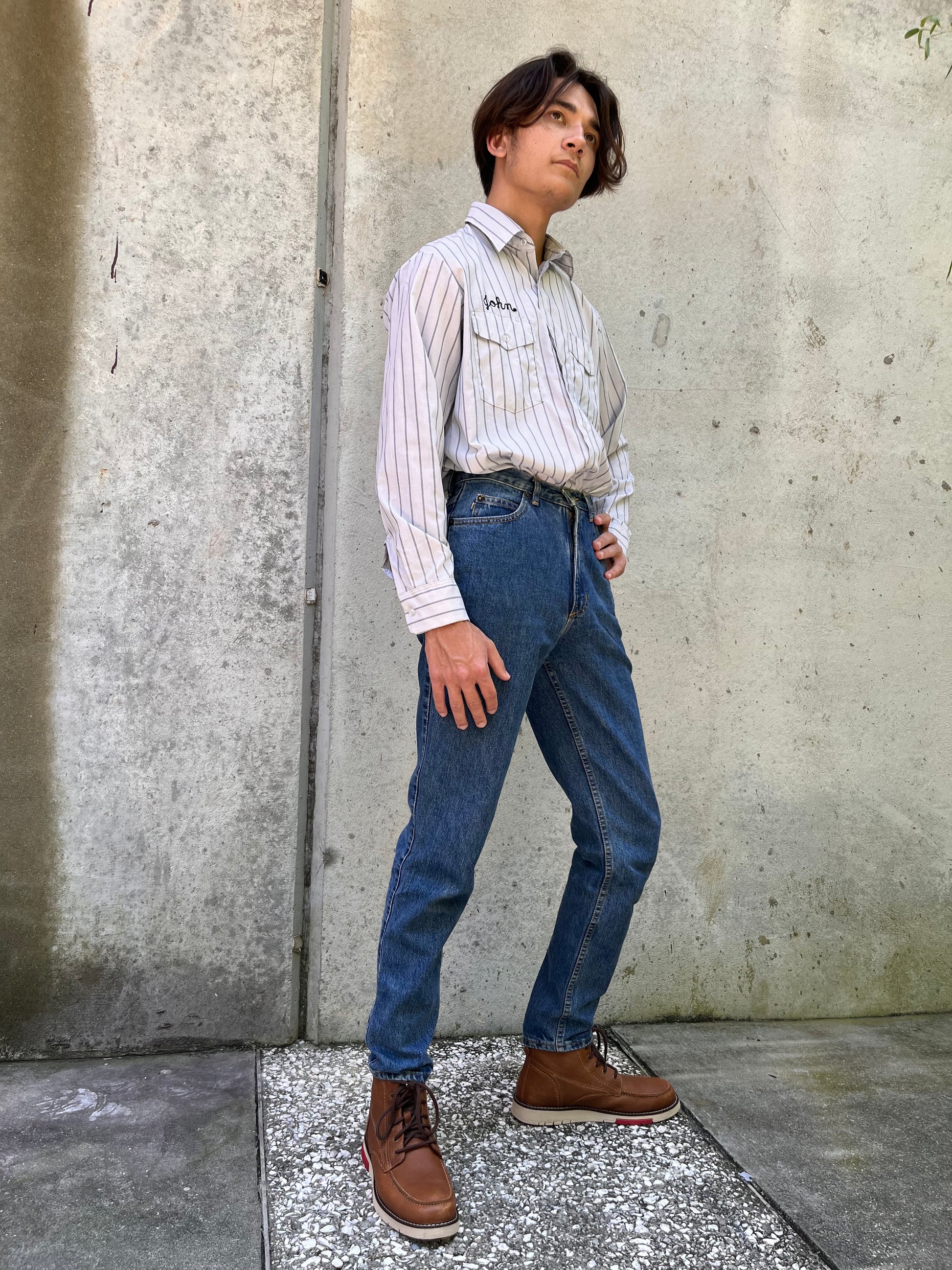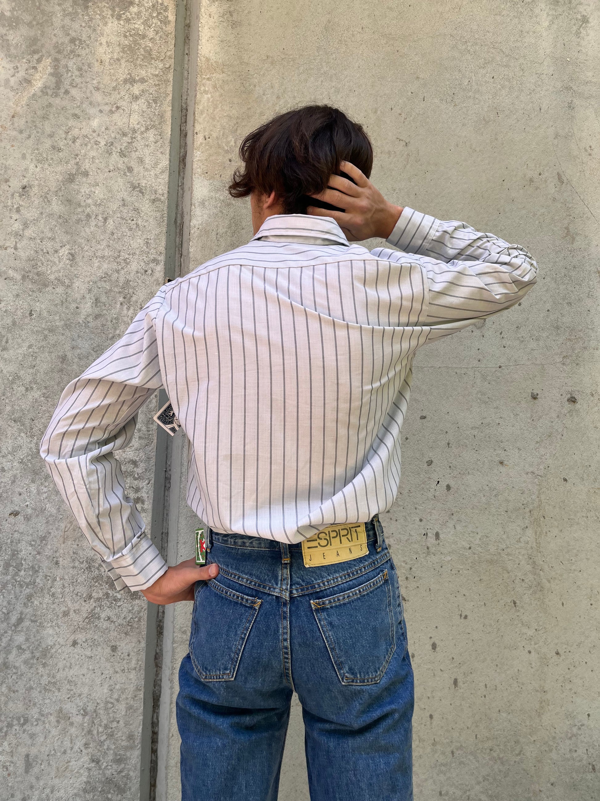 1970s Unitog White & Grey Striped "John" Embroidered Button-Up