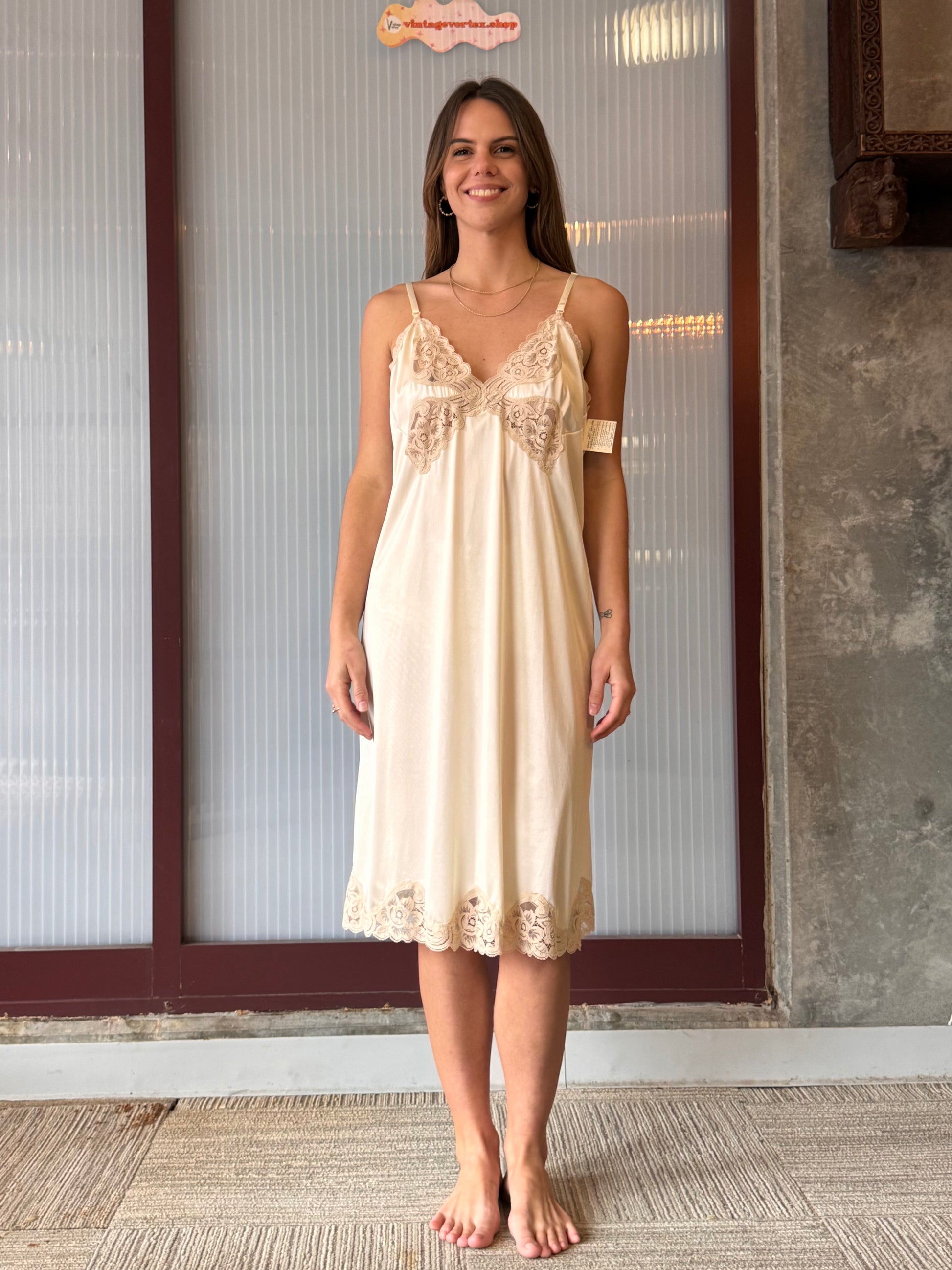 1970s Vanity Fair cream slip with beige lace neckline and hem