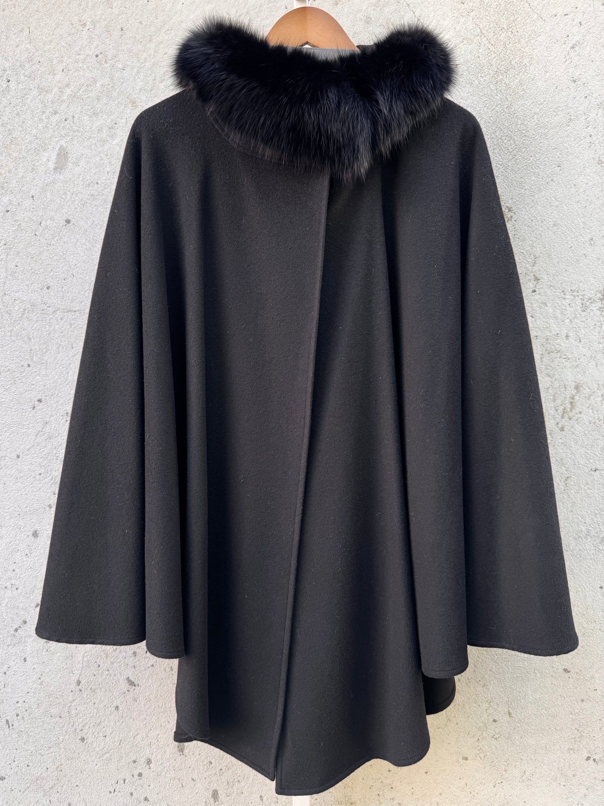 1980s Burberry Black Wool & Cashmere Cape with Fox Fur Collar