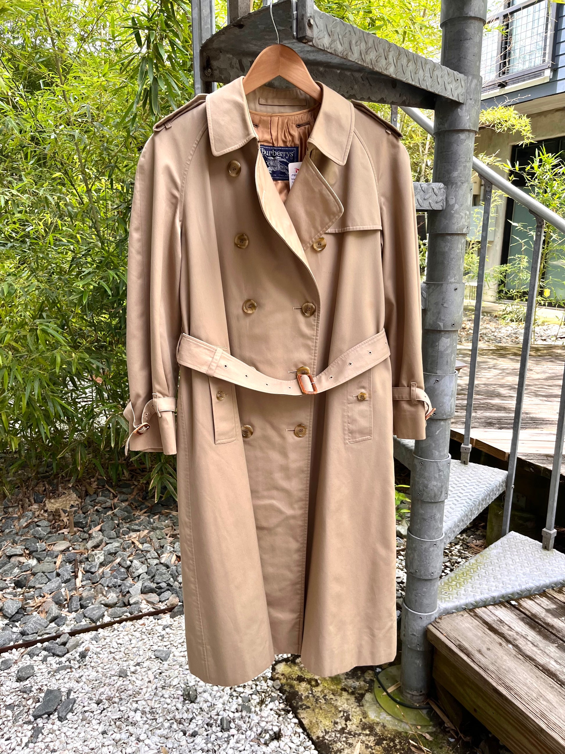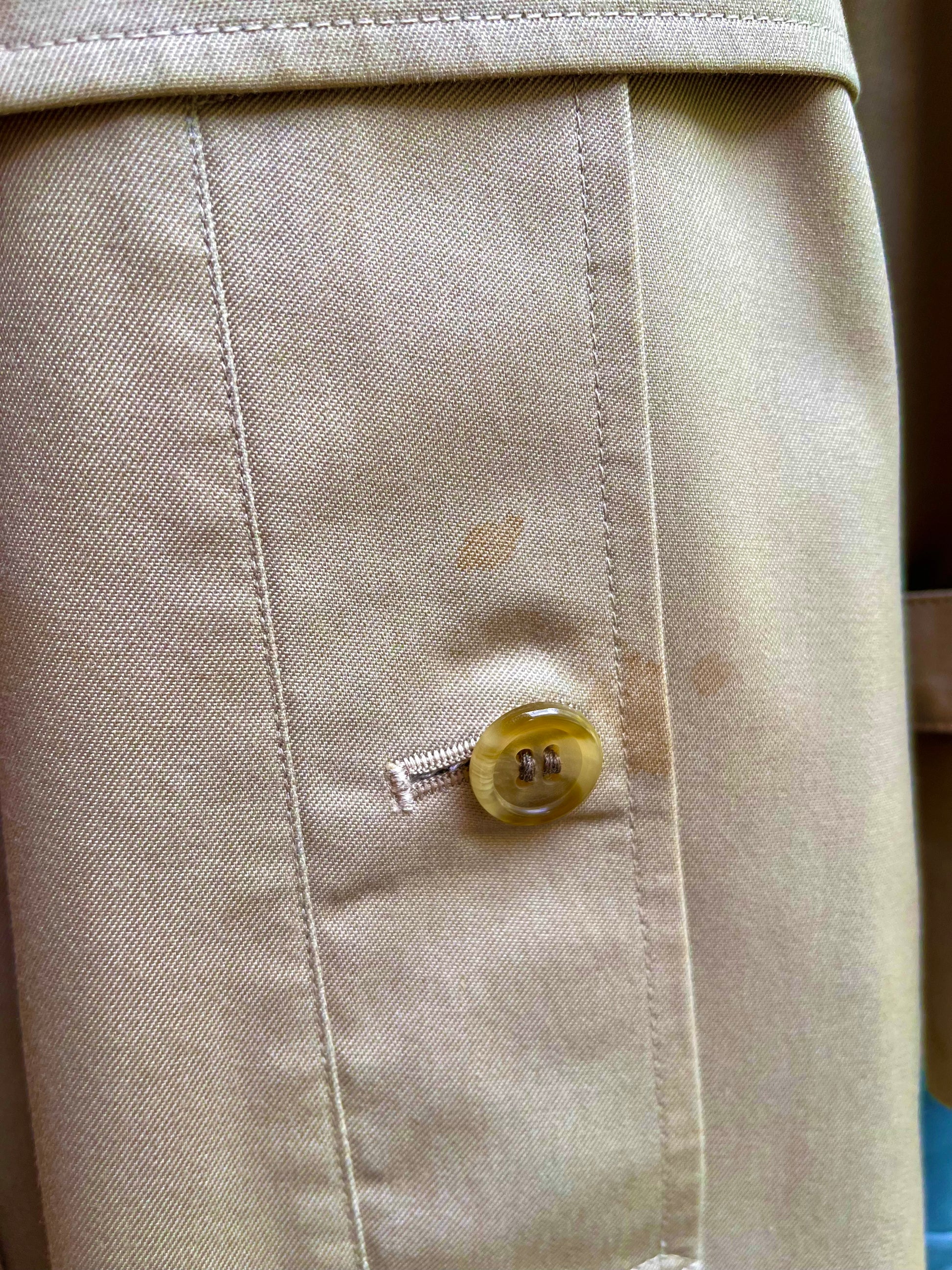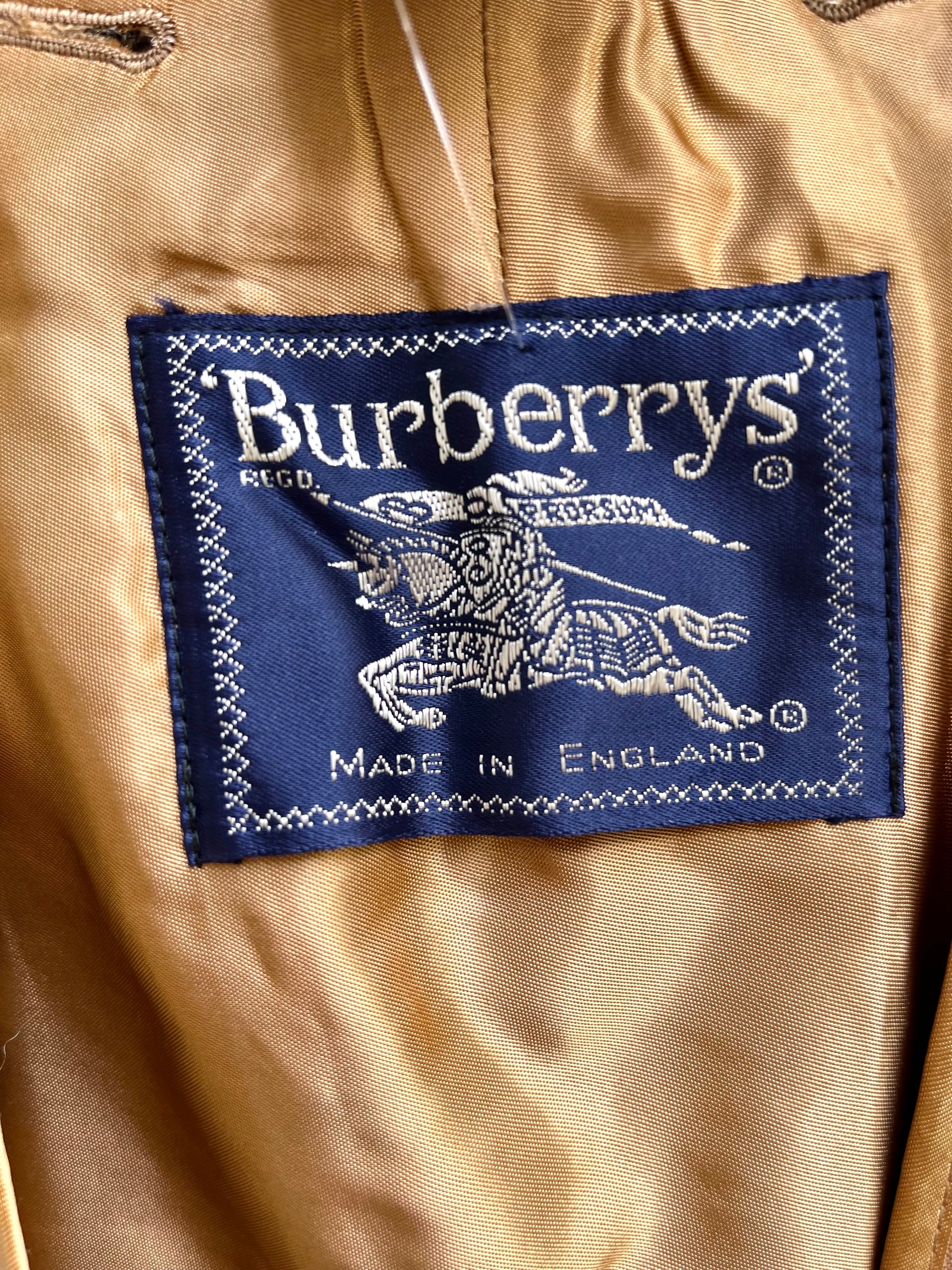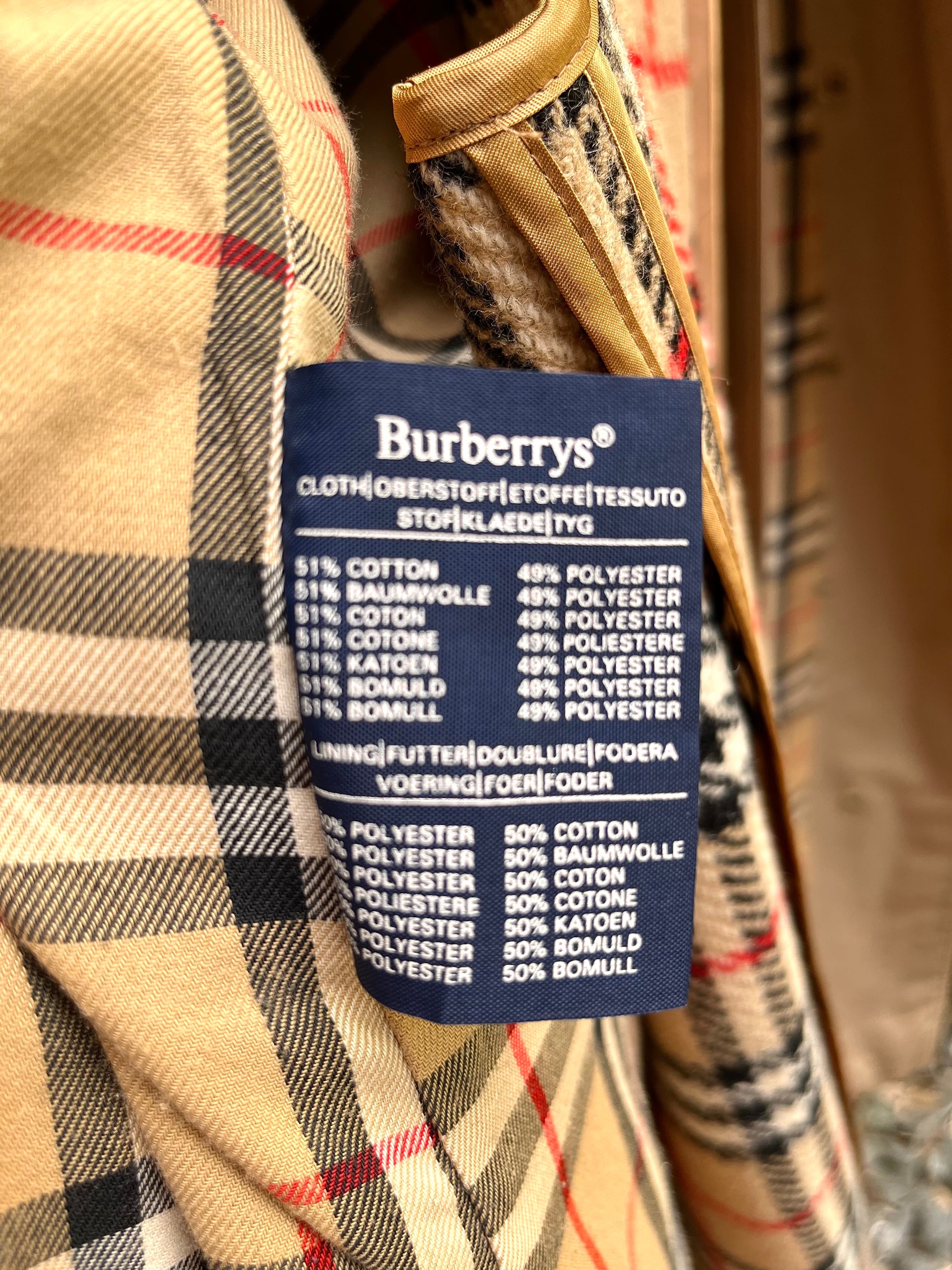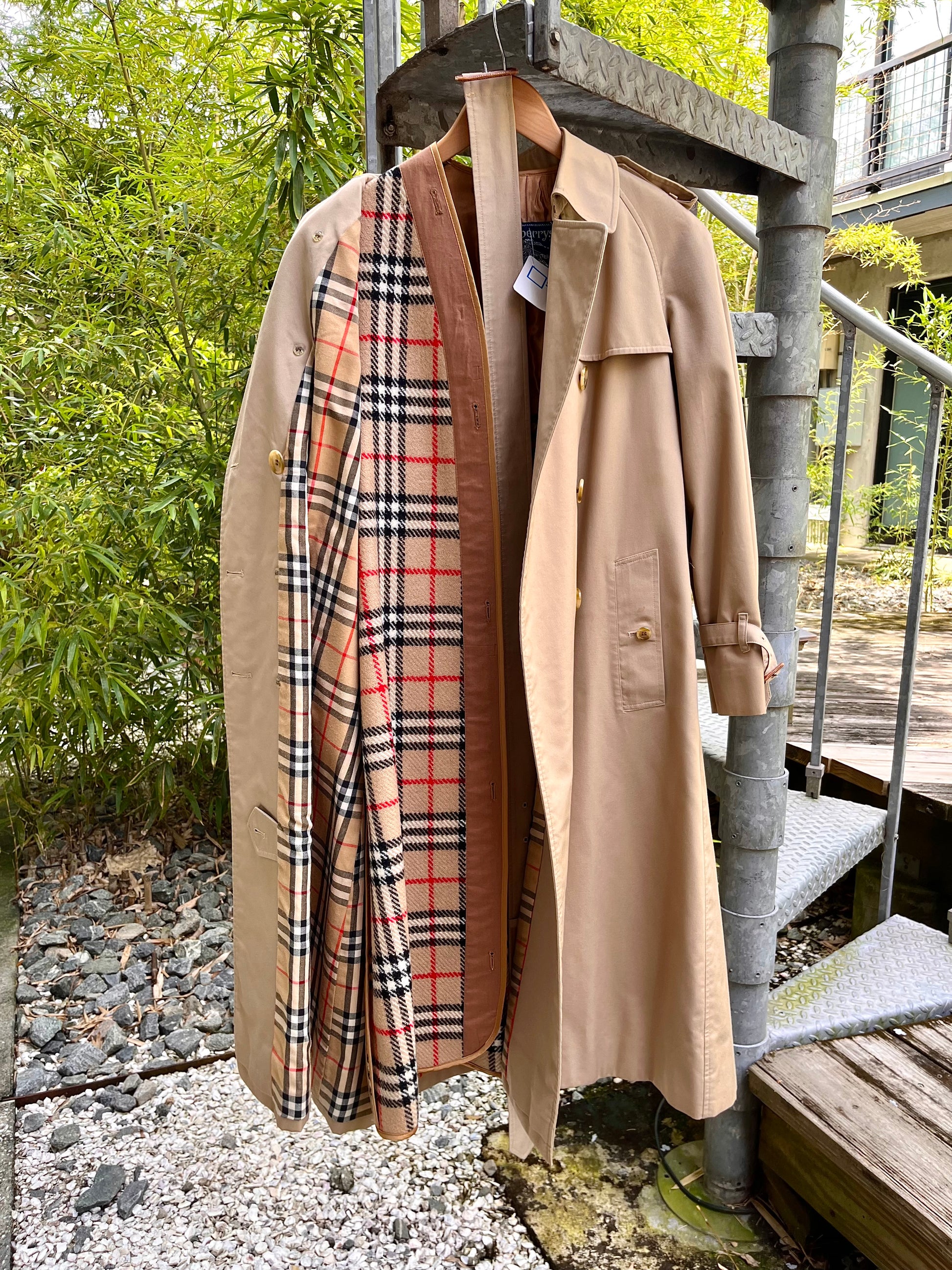 3-piece 1980's Burberry trench coat set consisting of the coat, a removable lining, and a belt. Condition is overall good with minimal stains as shown on the left pocket and right sleeve-end. Leather buckles also slightly worn.
