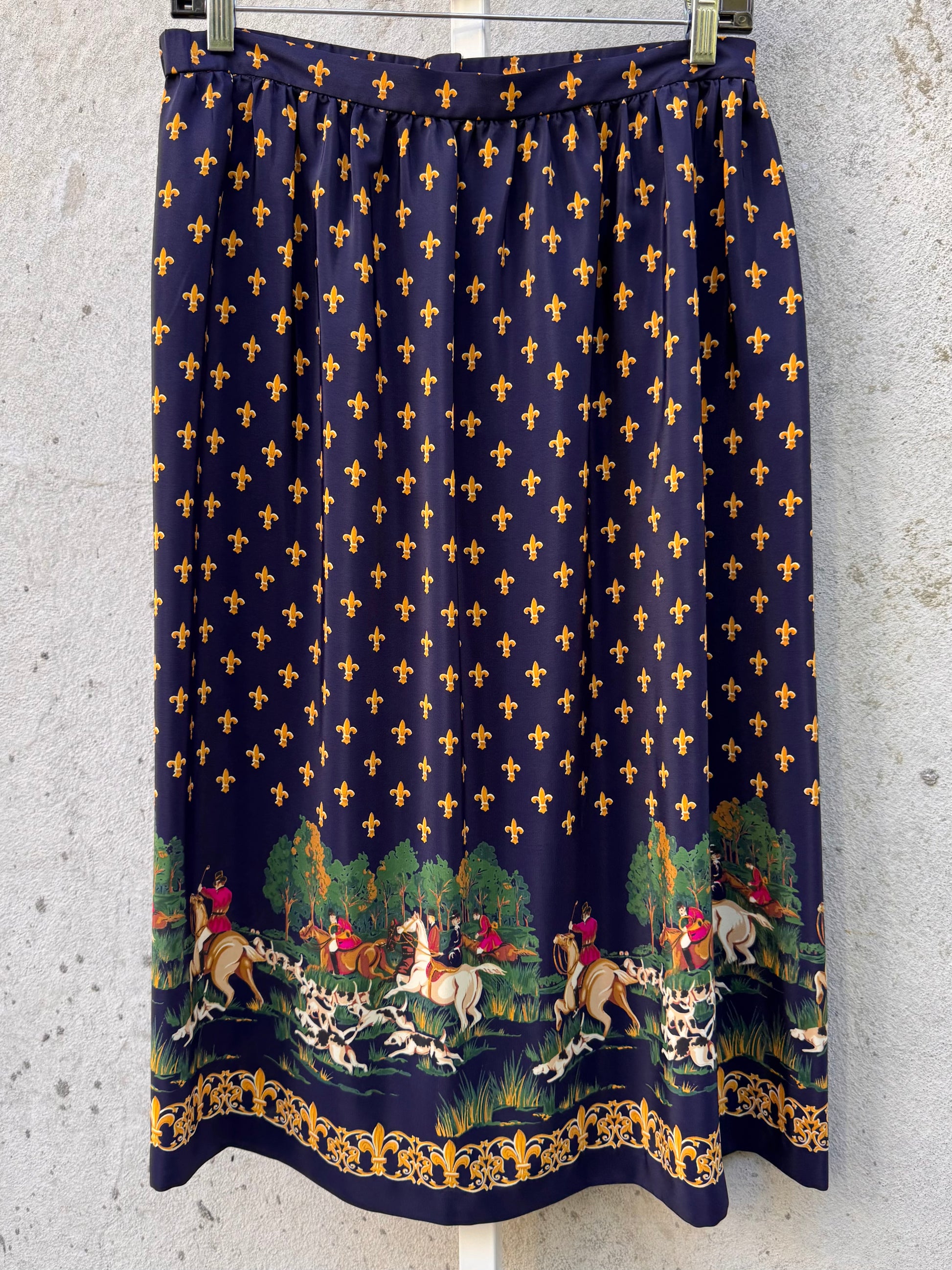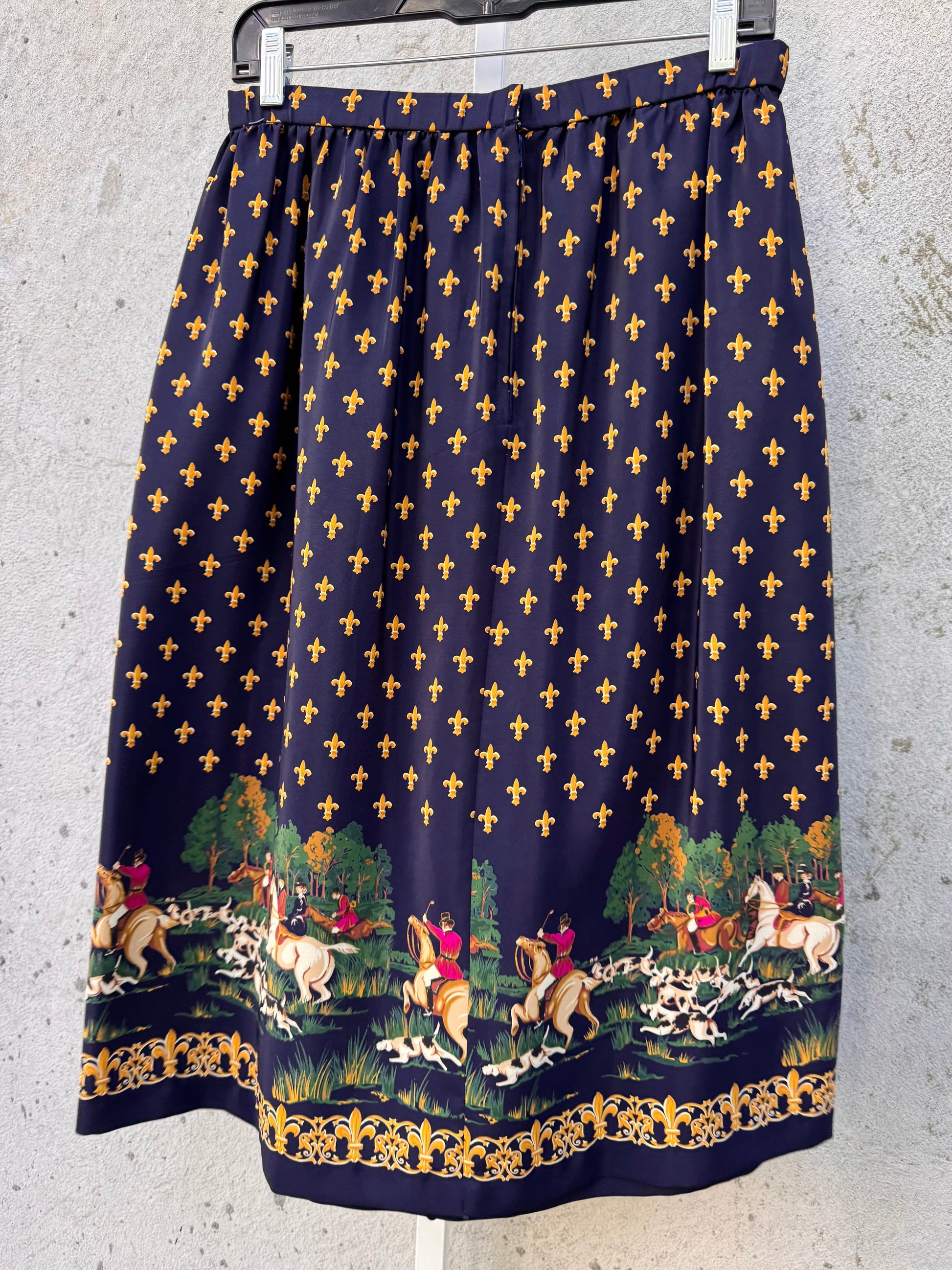 1980s Navy Blue Fox Hunting Print Midi Skirt