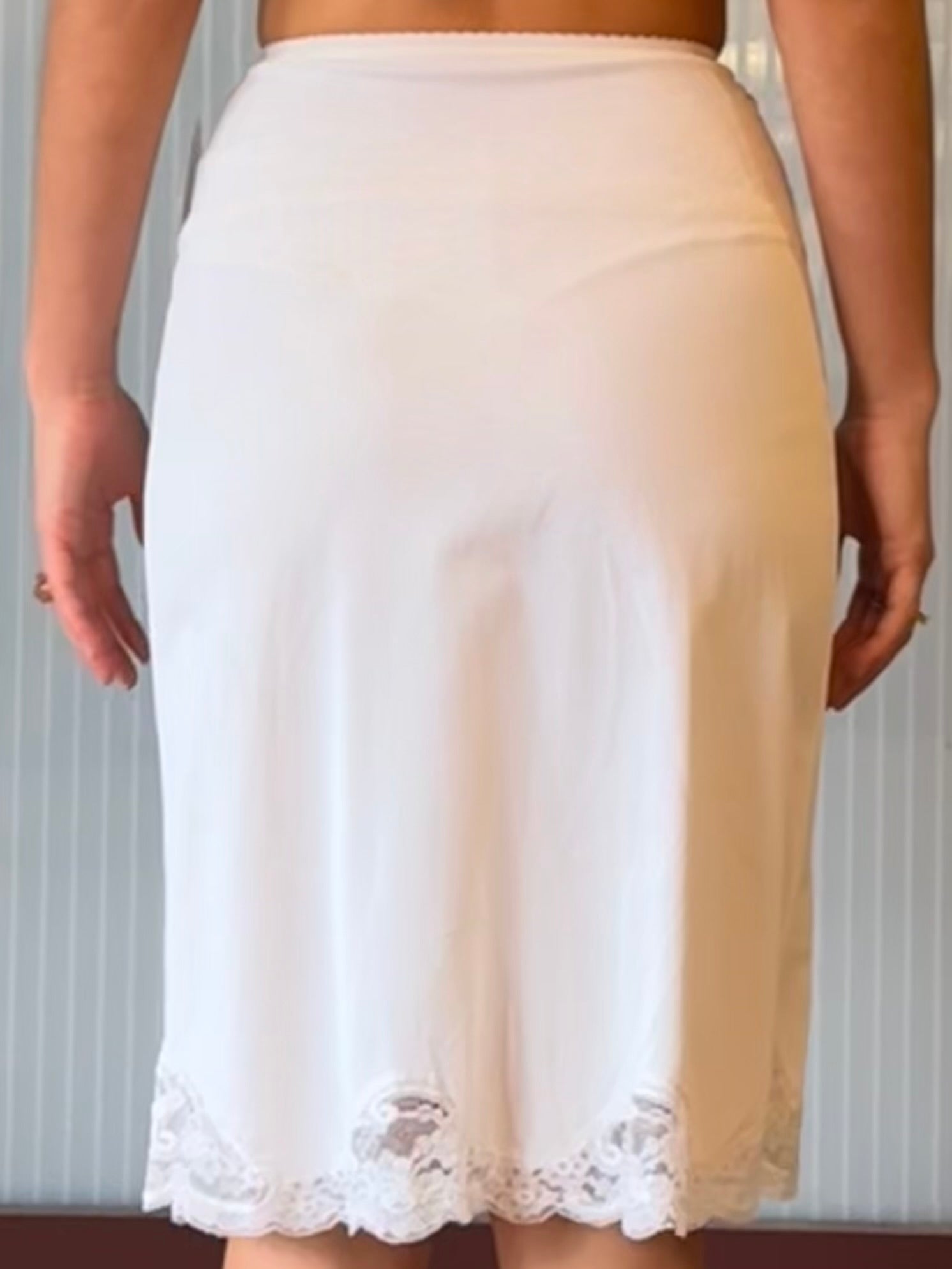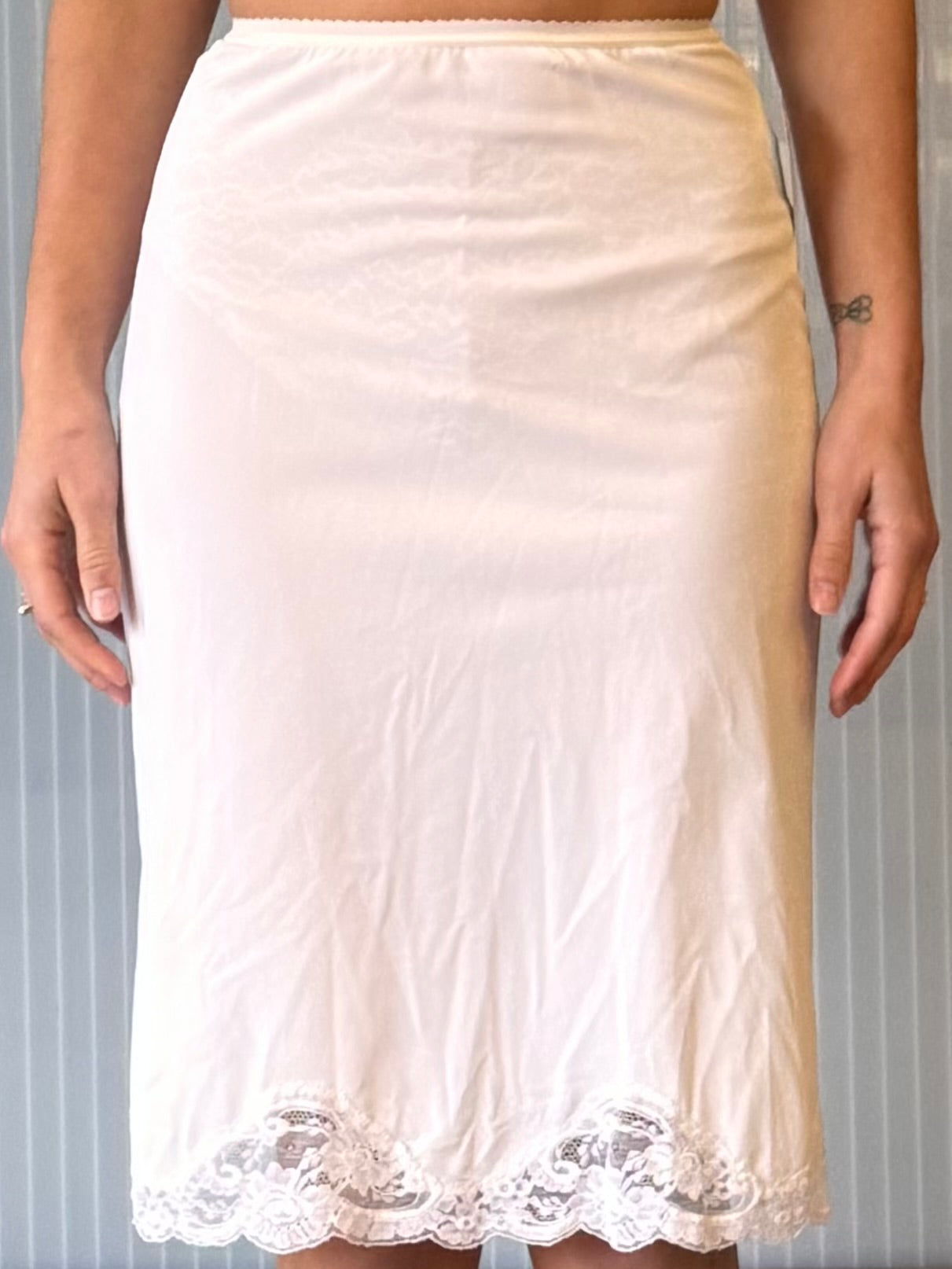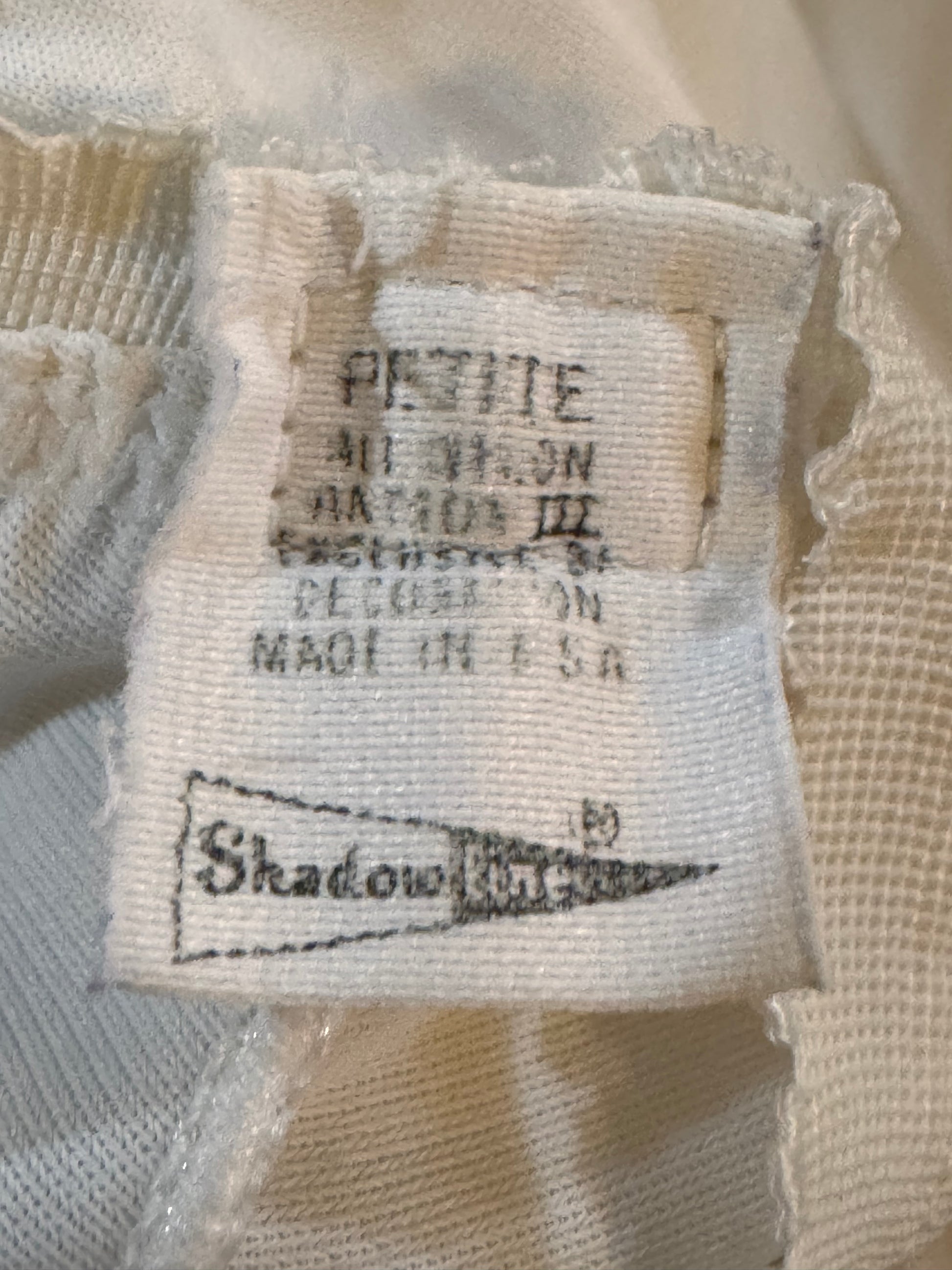 Late 1970s / Early 1980s Shadowline white skirt slip with scalloped lace hem
