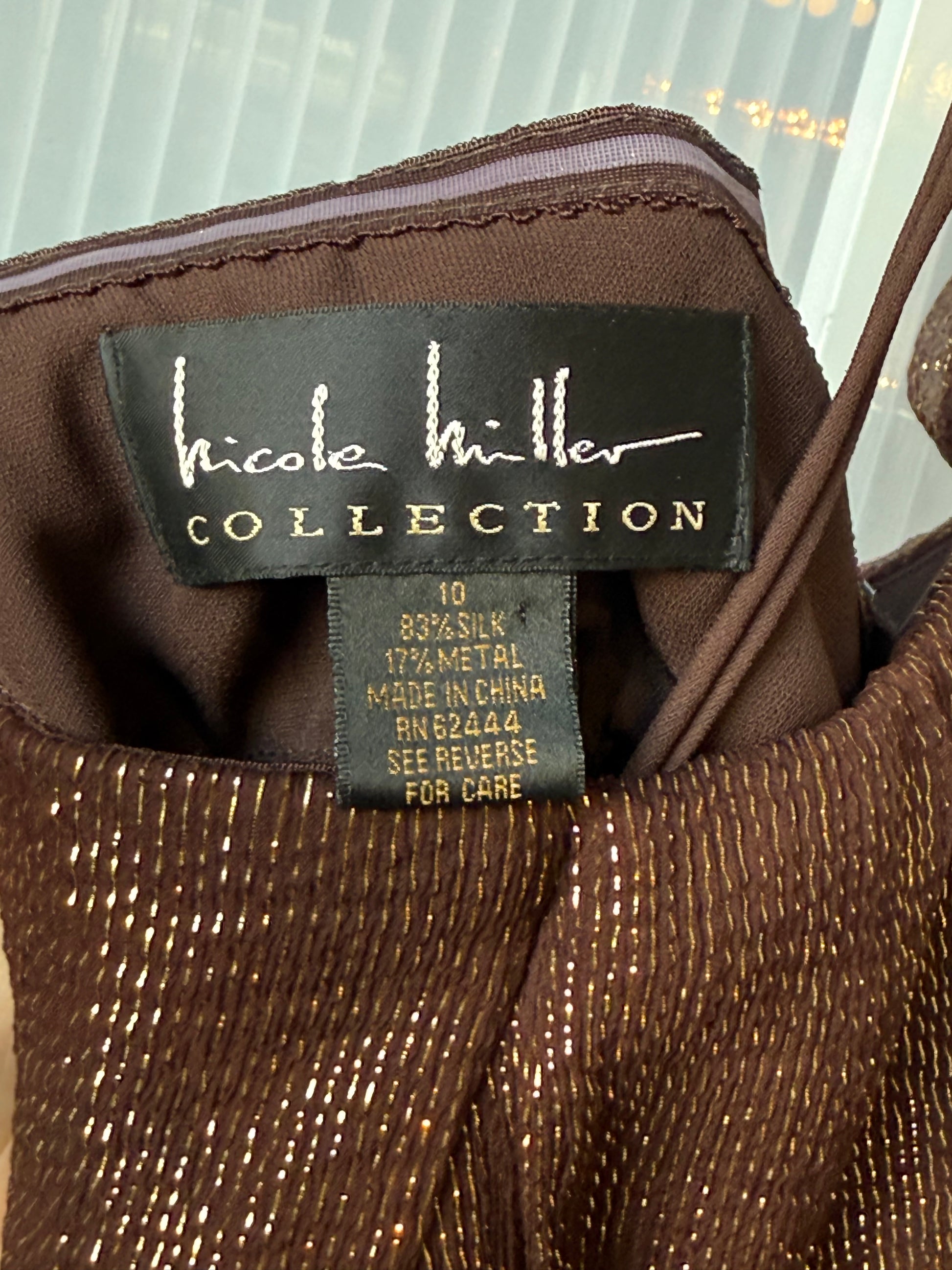 2000s Nicole Miller Brown and Gold Sparkly Halter Dress