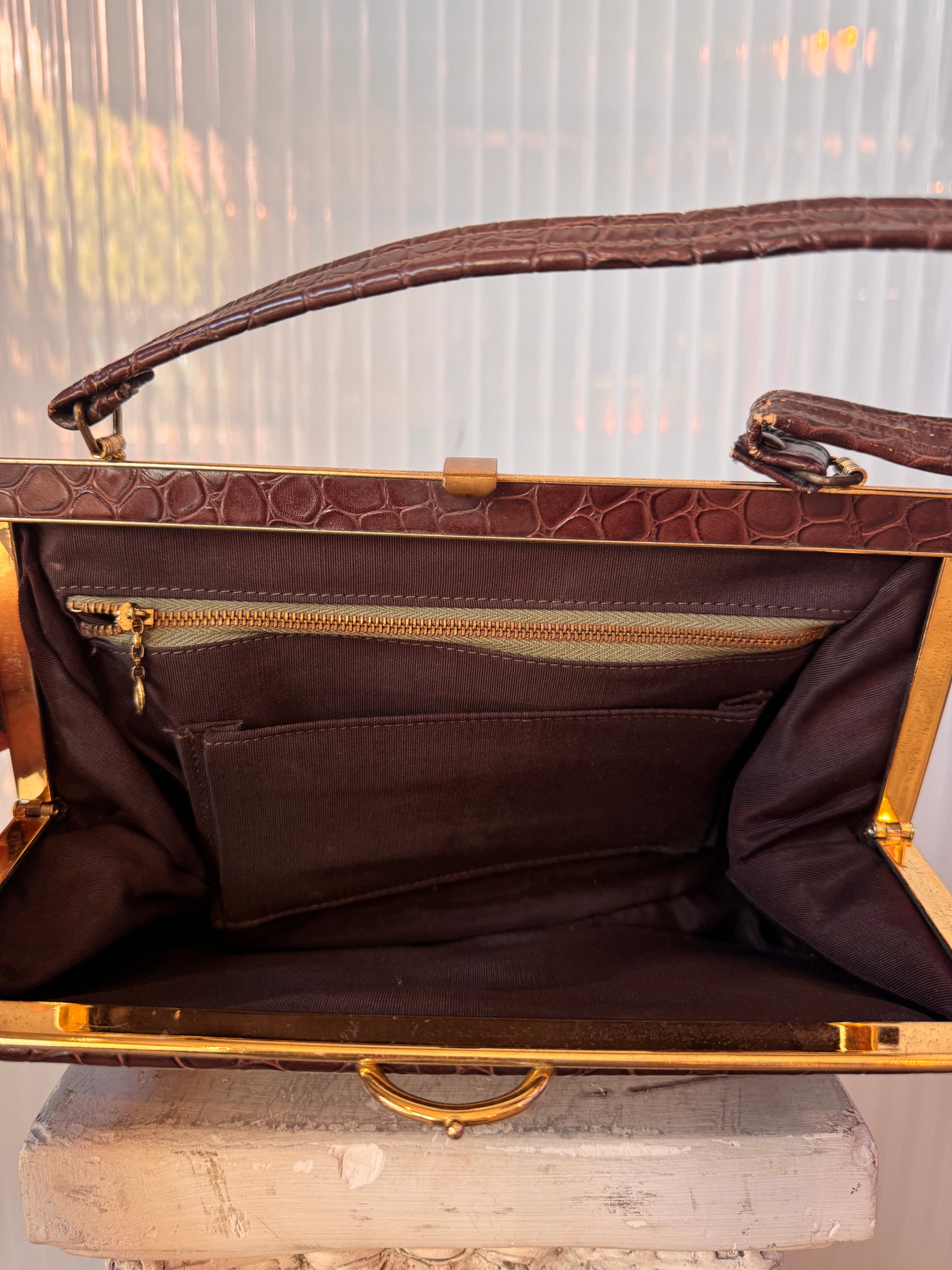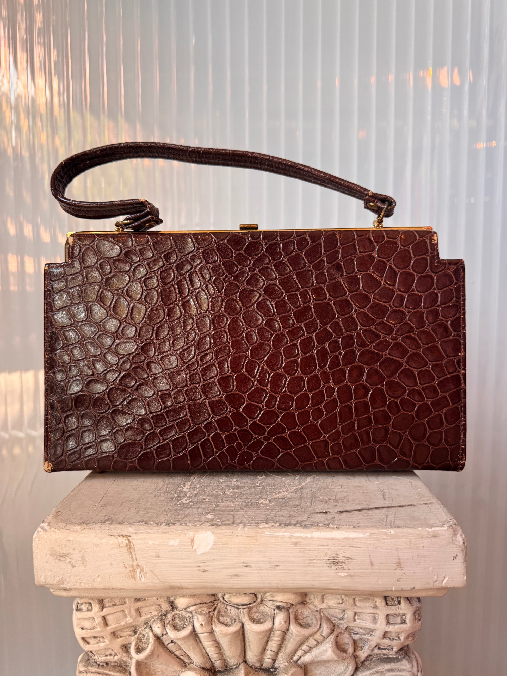 1950s Dark Brown Gator Embossed Hand Bag