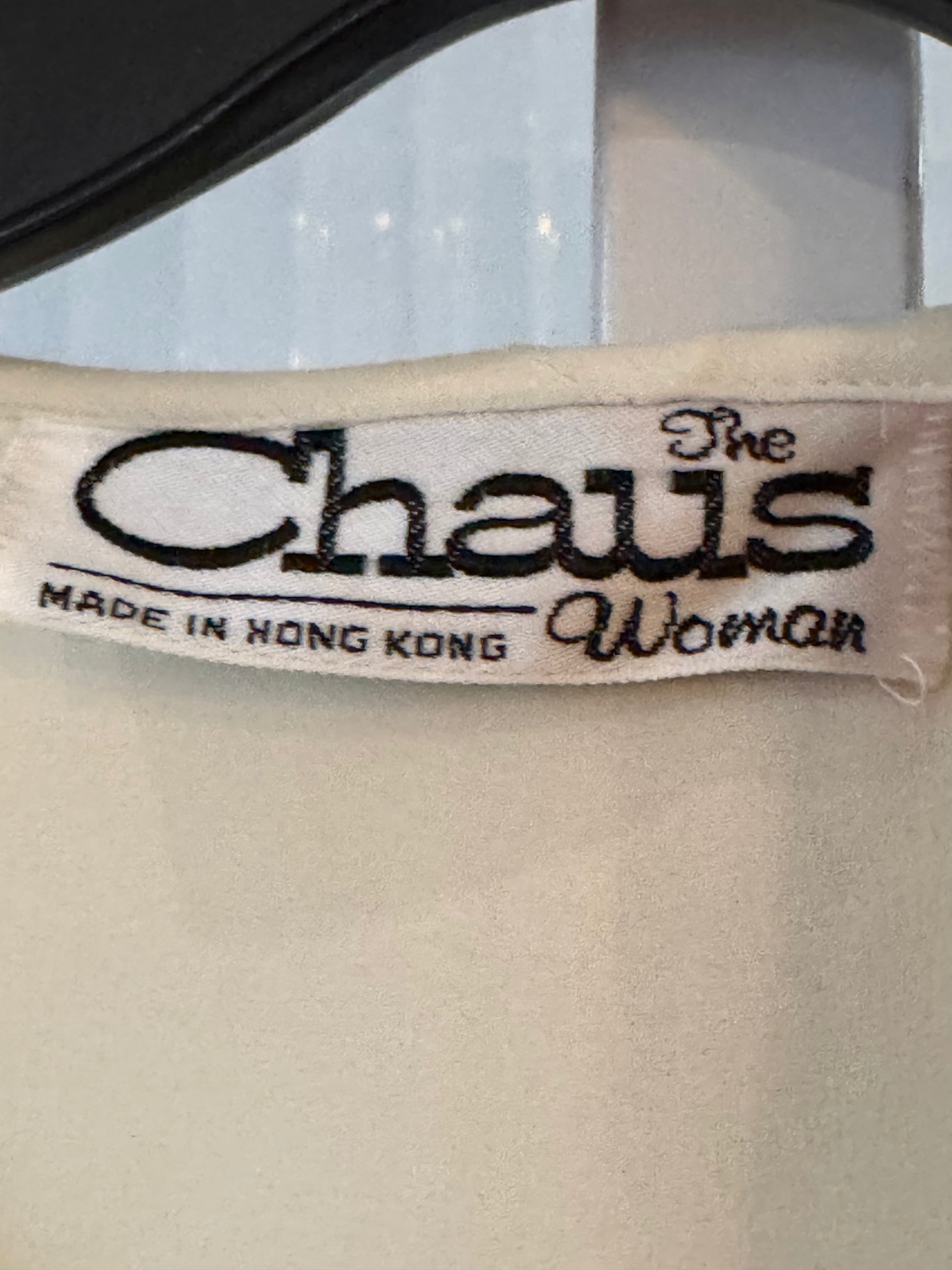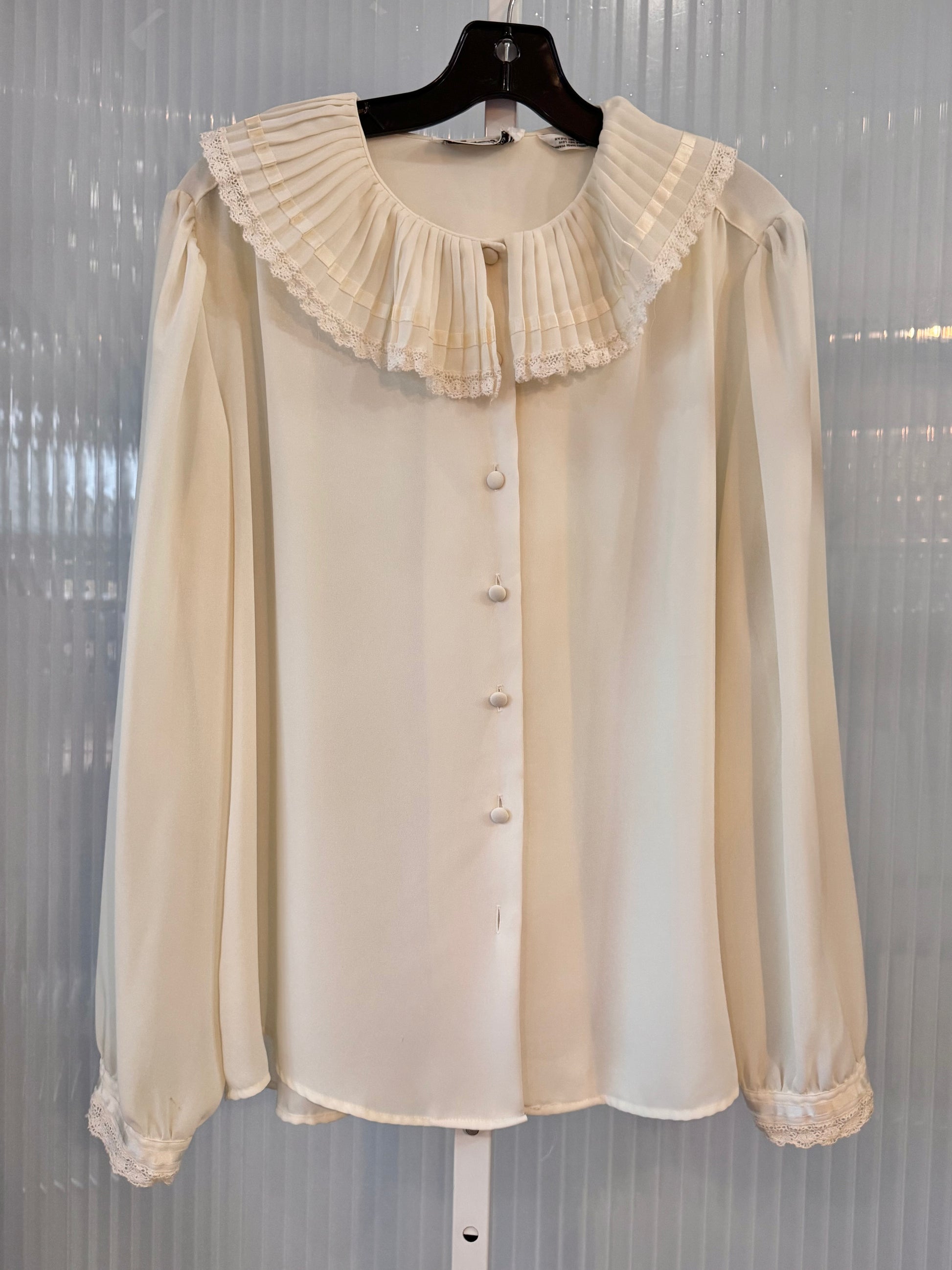 1980s Long-sleeve ivory blouse with pleated collar and ecru lace trim