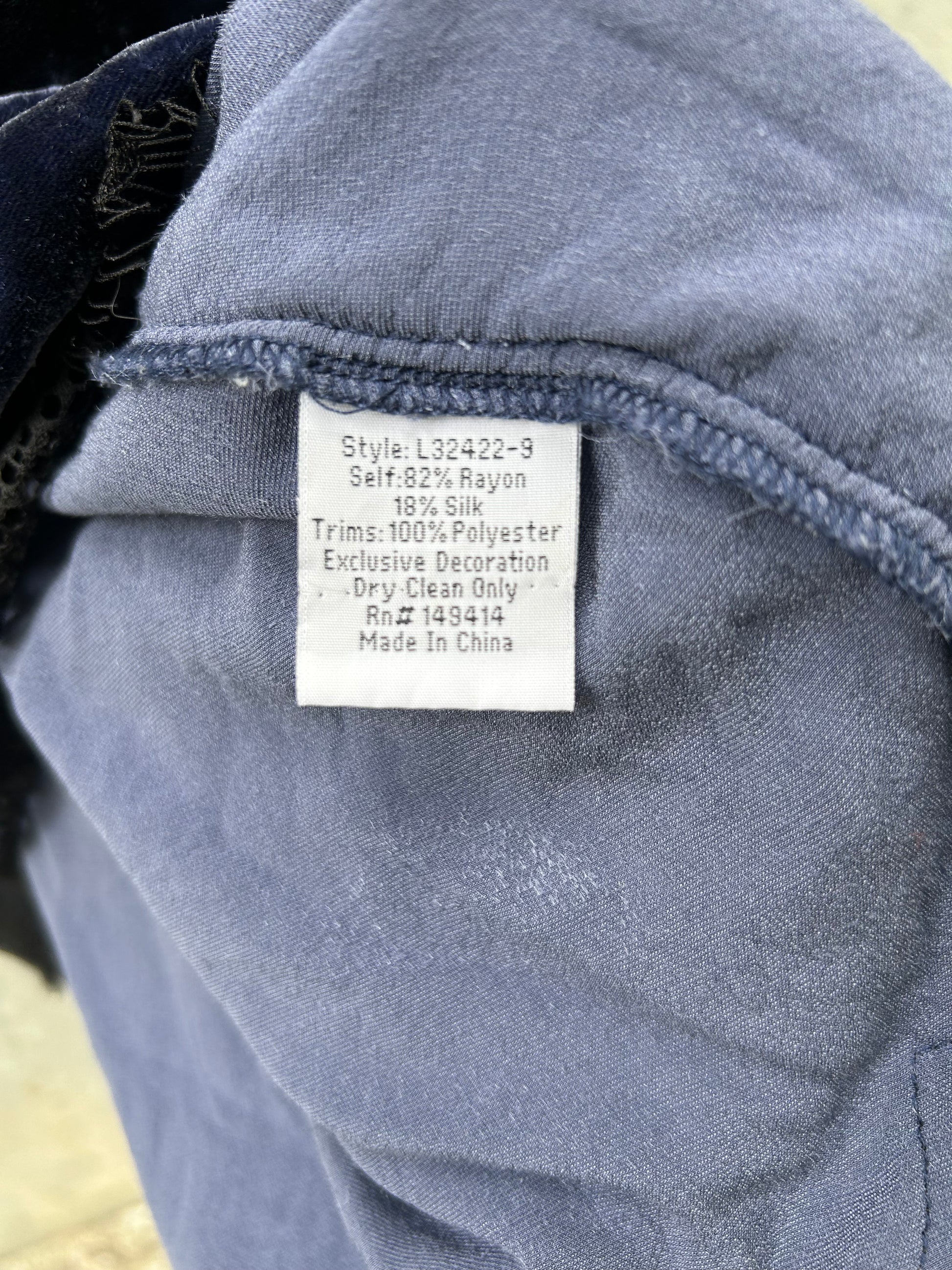 Contents: 82% rayon 18% silk, trims - 100% polyester