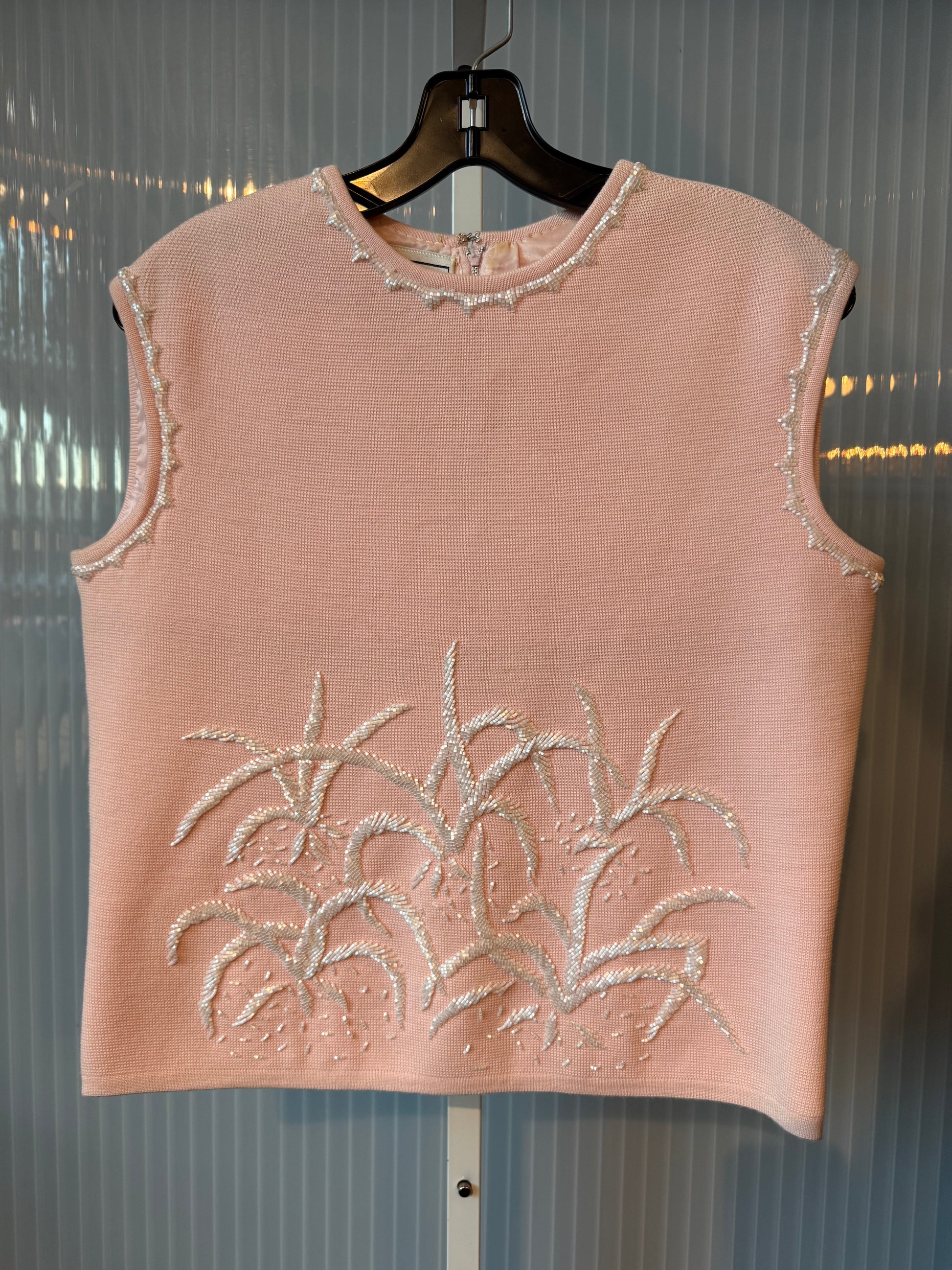 1960s Pink 100% Wool Sleeveless Top w/ White Beading