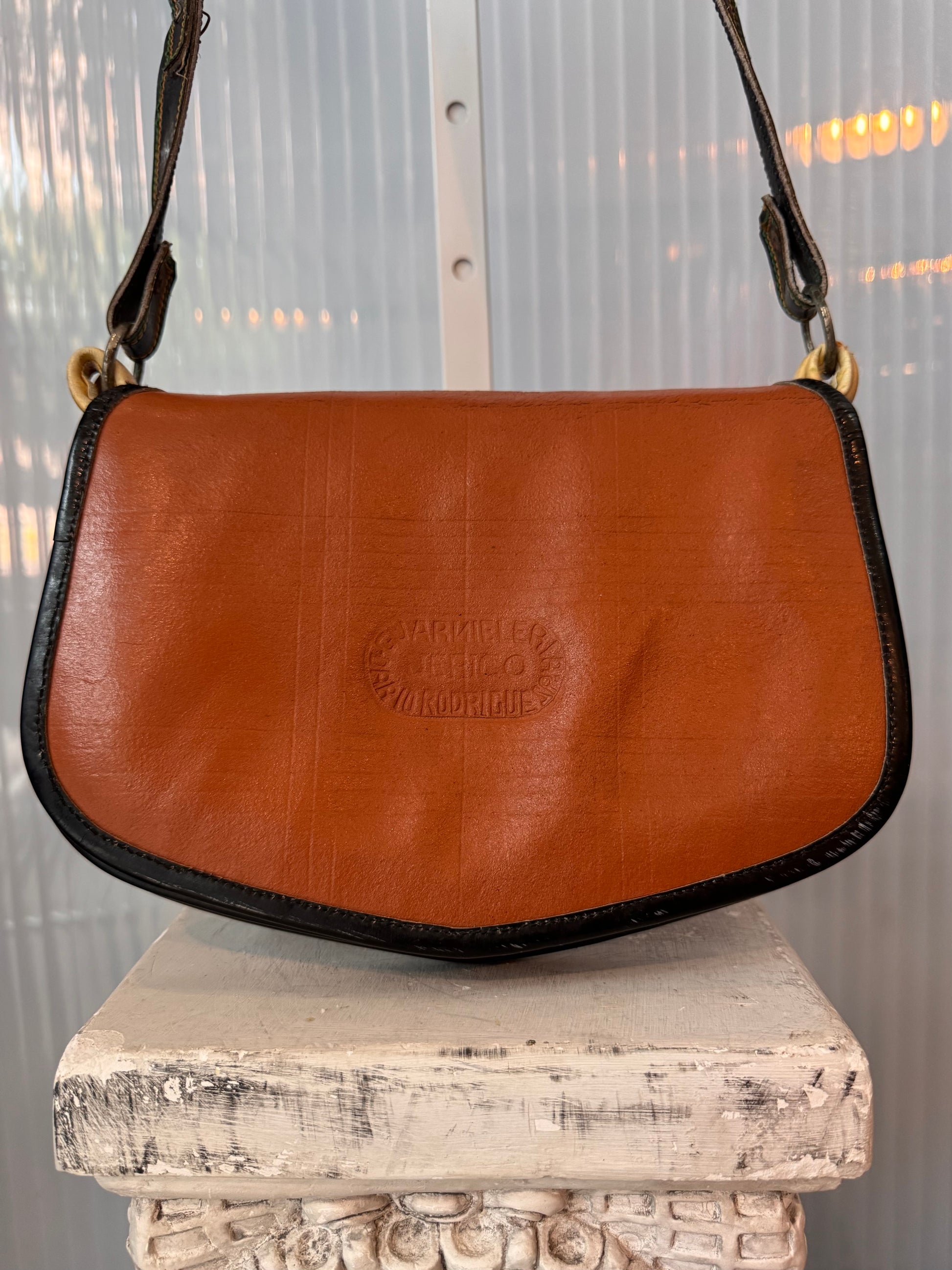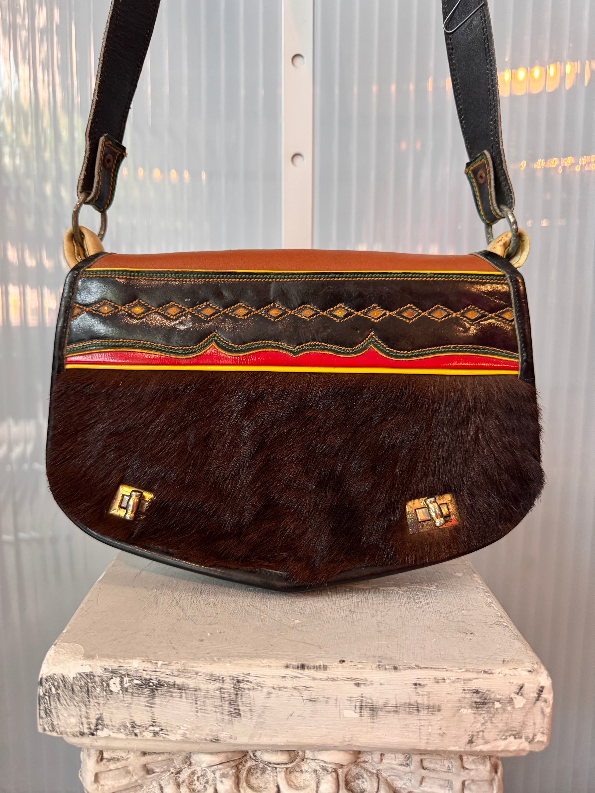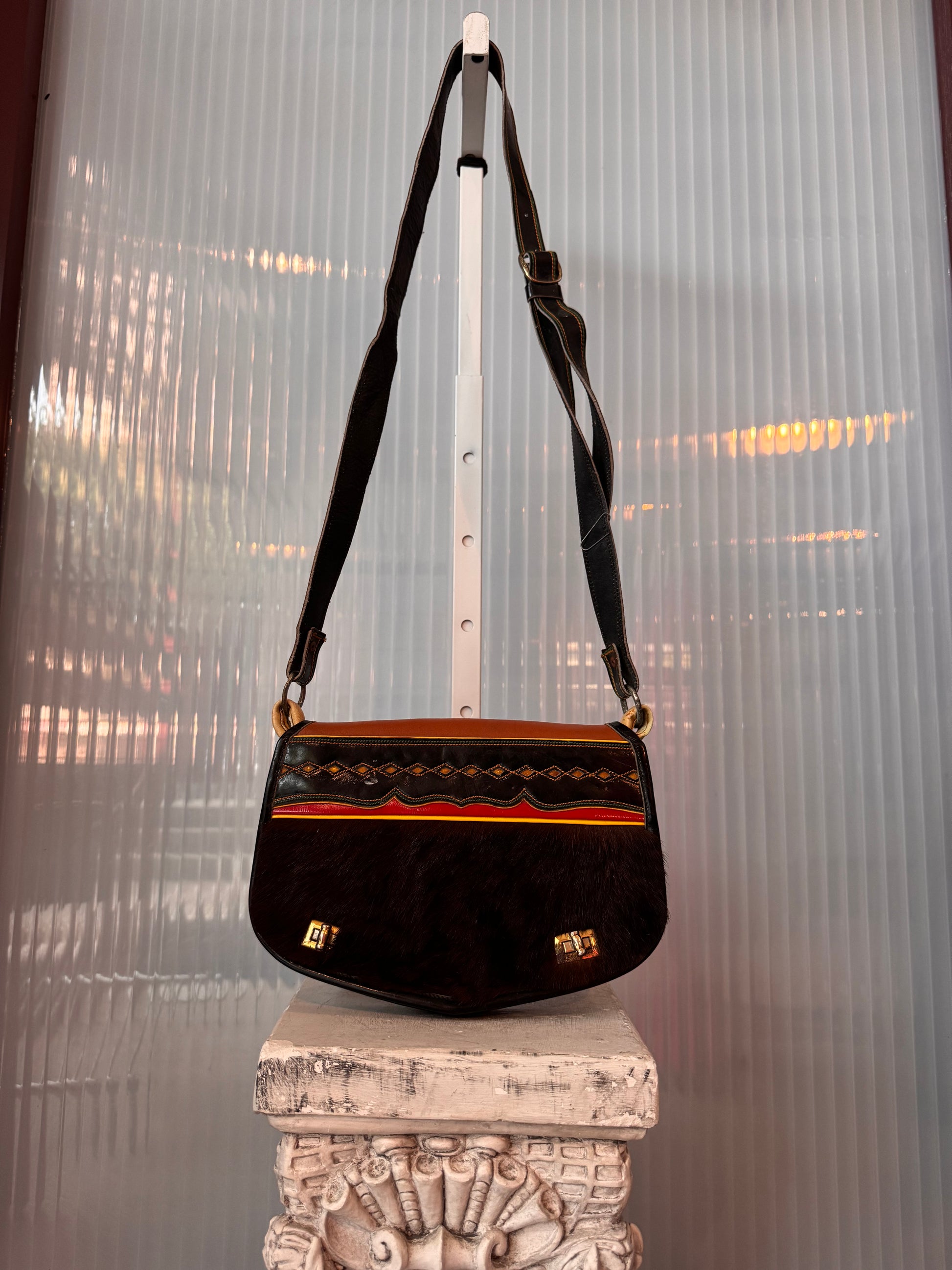Brown, red, and black leather and fur Colombian carriel crossbody bag