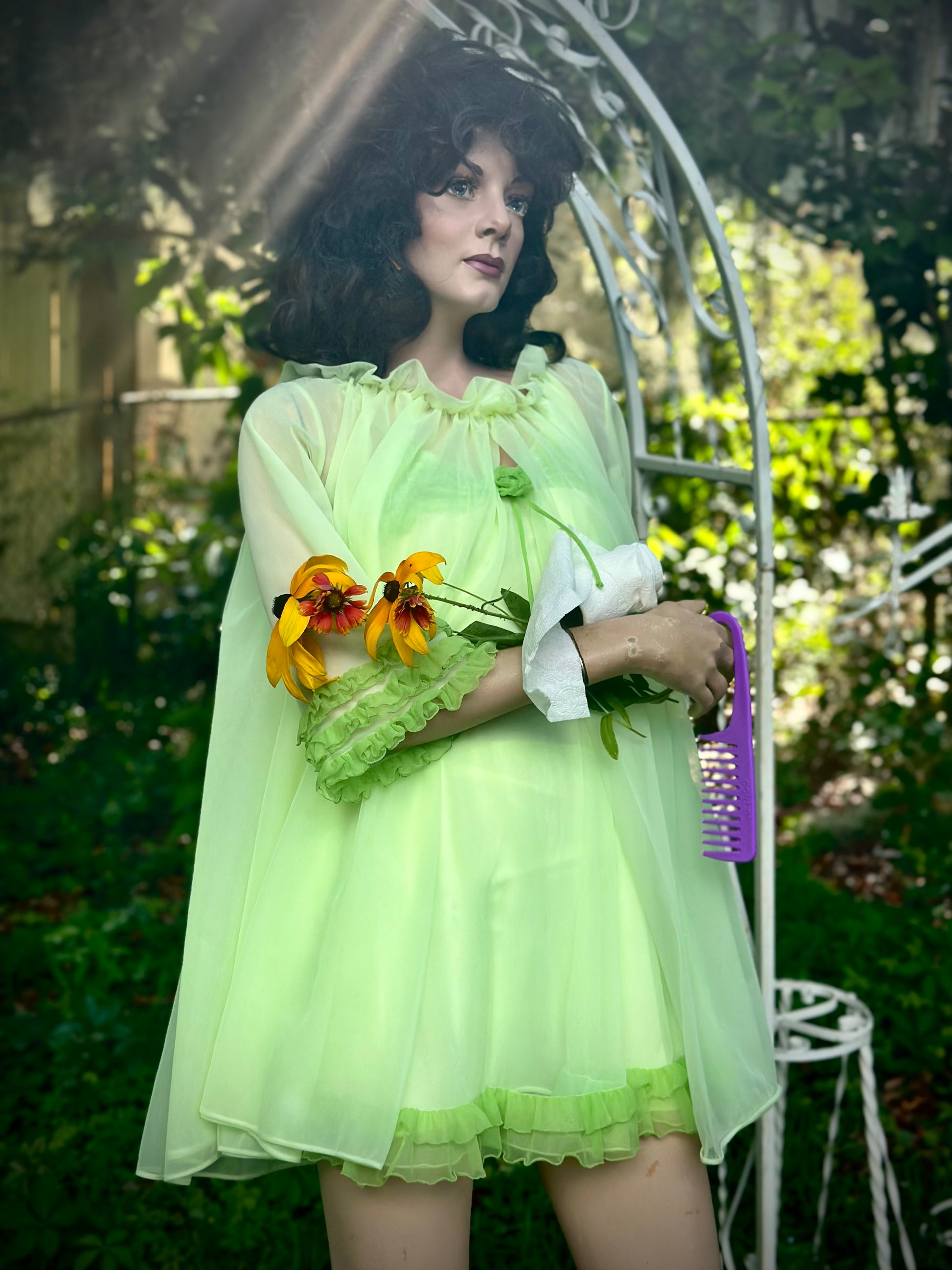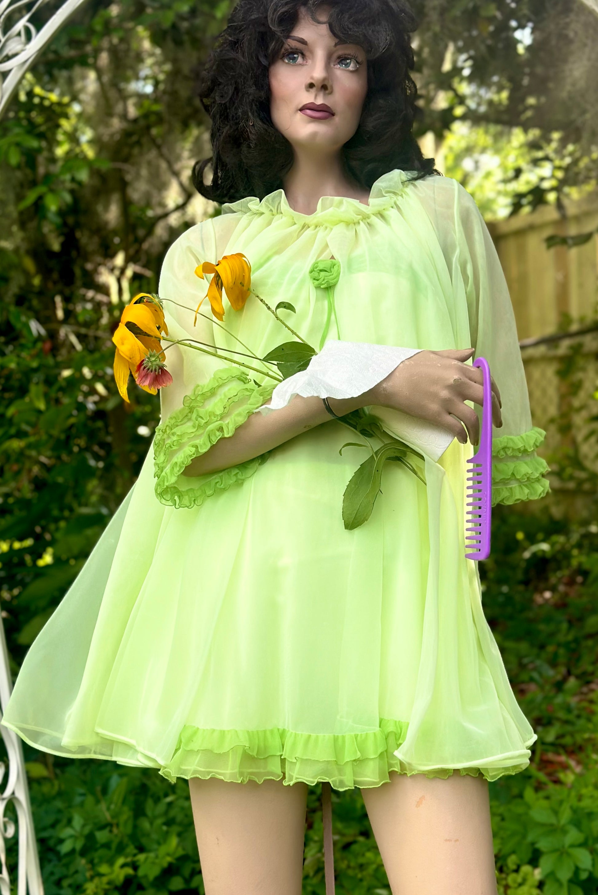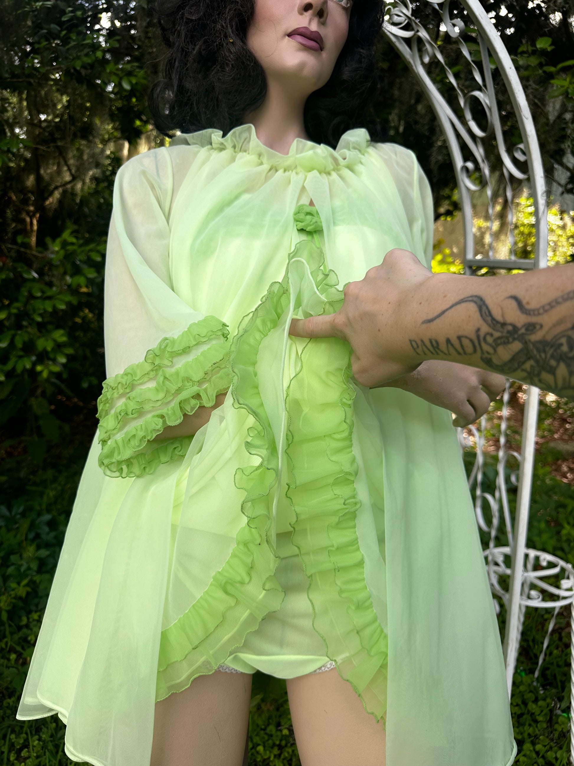 Indulge in vintage luxury with this heavenly 3-piece Key Lime Pie Peignoir Set. Straight from the glamorous 1960s era, this set exudes elegance & sophistication. With delicate detailing & a refreshing key lime colour, this set is sure to make you feel like a work of art. 😍