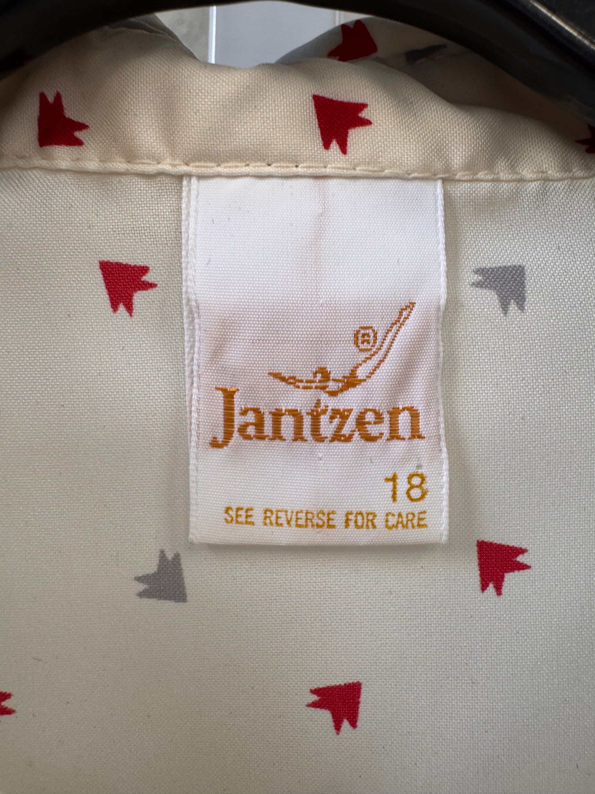 1970s Jantzen White Blouse with Geometric Pattern & Neck Bow