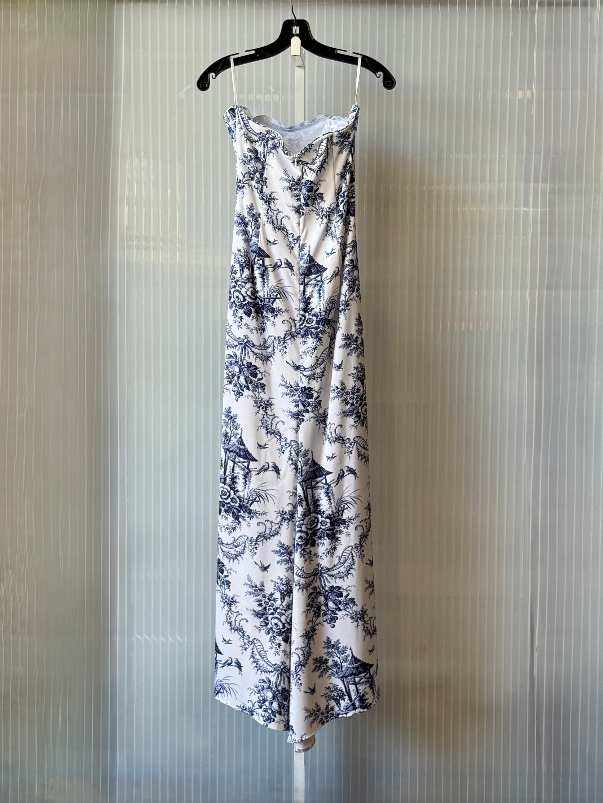 1990s Gunne Sax White and Blue Toile Strapless Gown