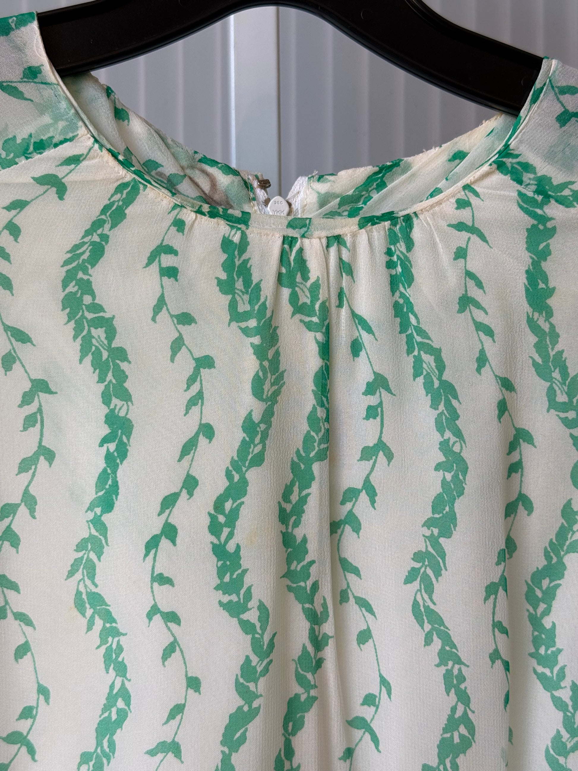 1960s White Chiffon Dress w/ Green Vine Pattern