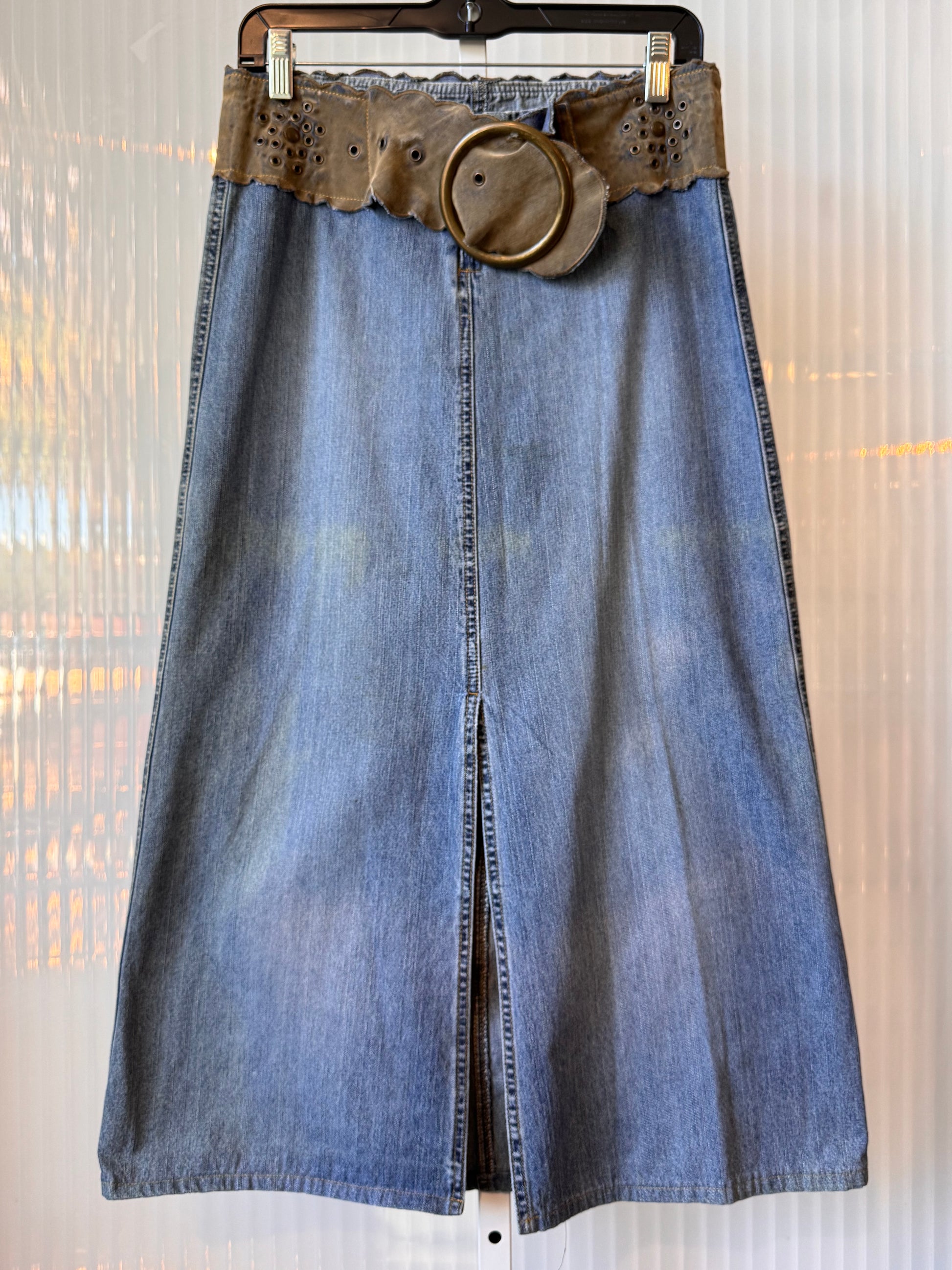 Early 2000s medium-wash denim skirt with chunky vevlet belt attached